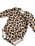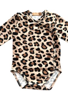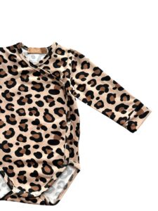 - Wygodny krój kopertowy – ułatwia ubieranie i przewijanie noworodka, bez konieczności przekładania przez główkę.