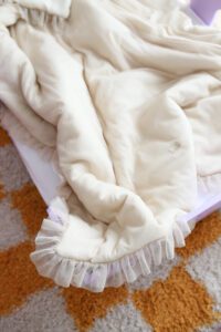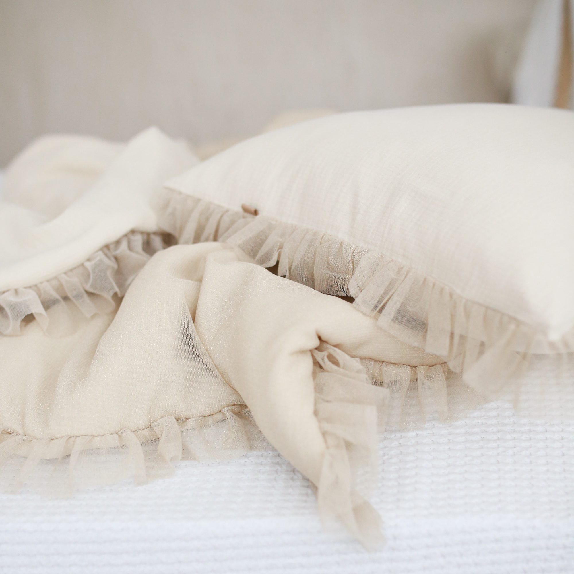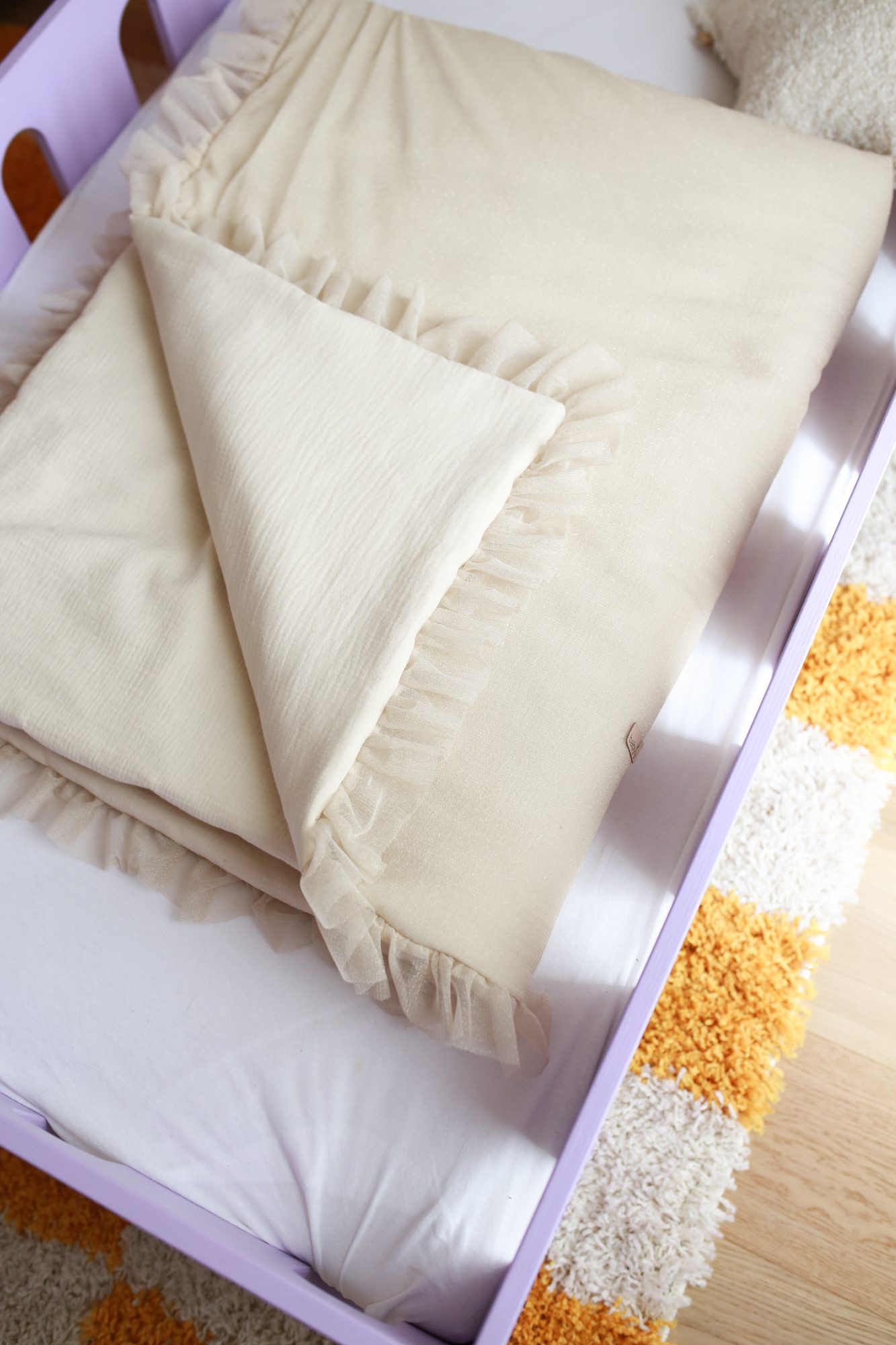 Zestaw pościelowy z jednej strony ozdobiliśmy miękkim brokatowym tiulem i falbanką, z drugiej strony to miękki, jeszcze delikatniejszy muślin. Kołderka posiada wszyte wypełnienie, z łatwością upierzesz ją w całości.