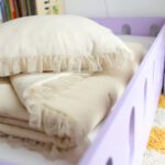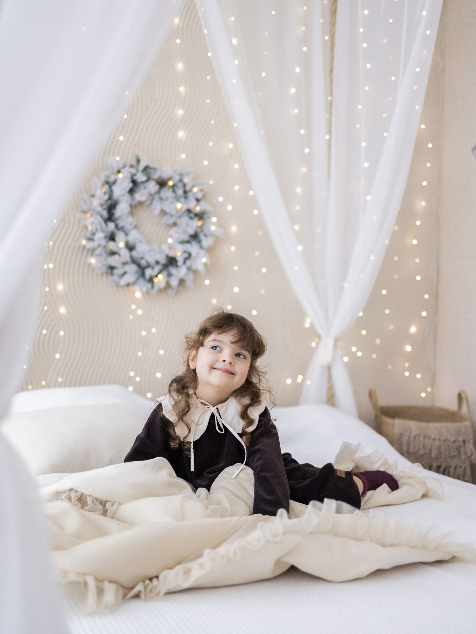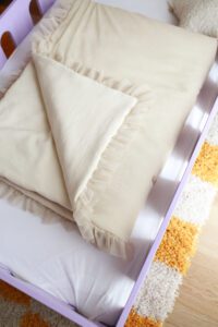 Pościel uszyłyśmy w 100% z certyfikowanego muślinu bawełnianego – lekkiego, przewiewnego i cudownie miękkiego. Ozdobiliśmy brokatowym, miękkim tiulem (nie, nie sypie się i nie spiera). Obie tkaniny są idealne dla wrażliwej skóry dziecka.