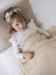 Poduszka w zestawie wykonana jest z poszewki muślinowej z brokatową falbanką i płaskiego wkładu – czyli zgodnie z zaleceniami fizjoterapeutów. Jeśli jednak korzystacie już z wyższej poduszki, z łatwością wymienicie wkład na swój ulubiony.