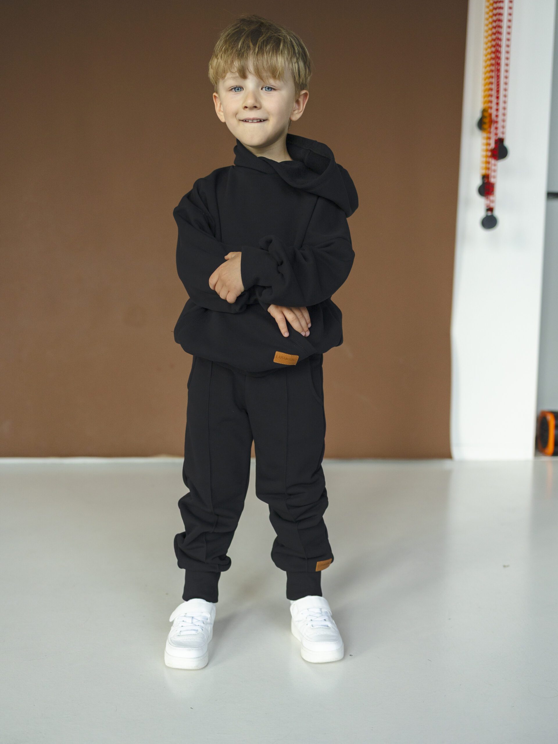 Czarny dres chłopięcy z kolekcji FAMILY to idealne połączenie stylu, wygody i jakości premium. Uszyty z miękkiej, elastycznej dresówki premium, zapewnia maksymalny komfort noszenia o każdej porze roku. W skład kompletu wchodzi bluza z kapturem i kieszenią typu kangurka oraz spodnie dresowe chłopięce z kieszeniami, wygodnymi ściągaczami i ozdobnymi przeszyciami przez środek nogawek, które nadają całości wyjątkowego charakteru.