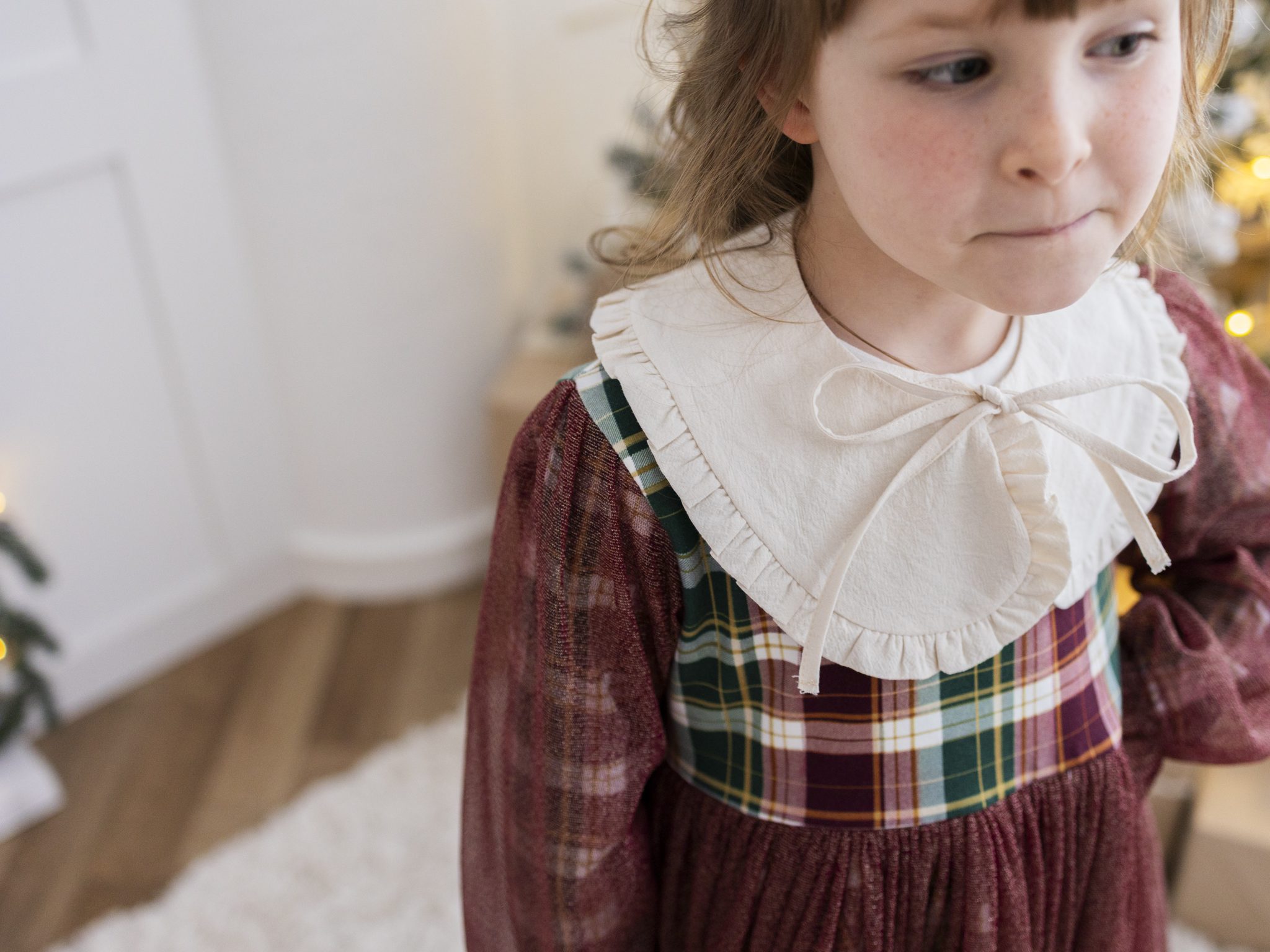 Kołnierzyk jest wiązany z przodu, dzięki czemu łatwo dopasujesz go do różnych ubrań – świetnie wygląda zarówno z prostą sukienką, jak i z bluzką, sweterkiem czy body. To uniwersalny element garderoby, który pozwala stworzyć milion stylizacji – od eleganckich po codzienne, od świątecznych po szkolne.
