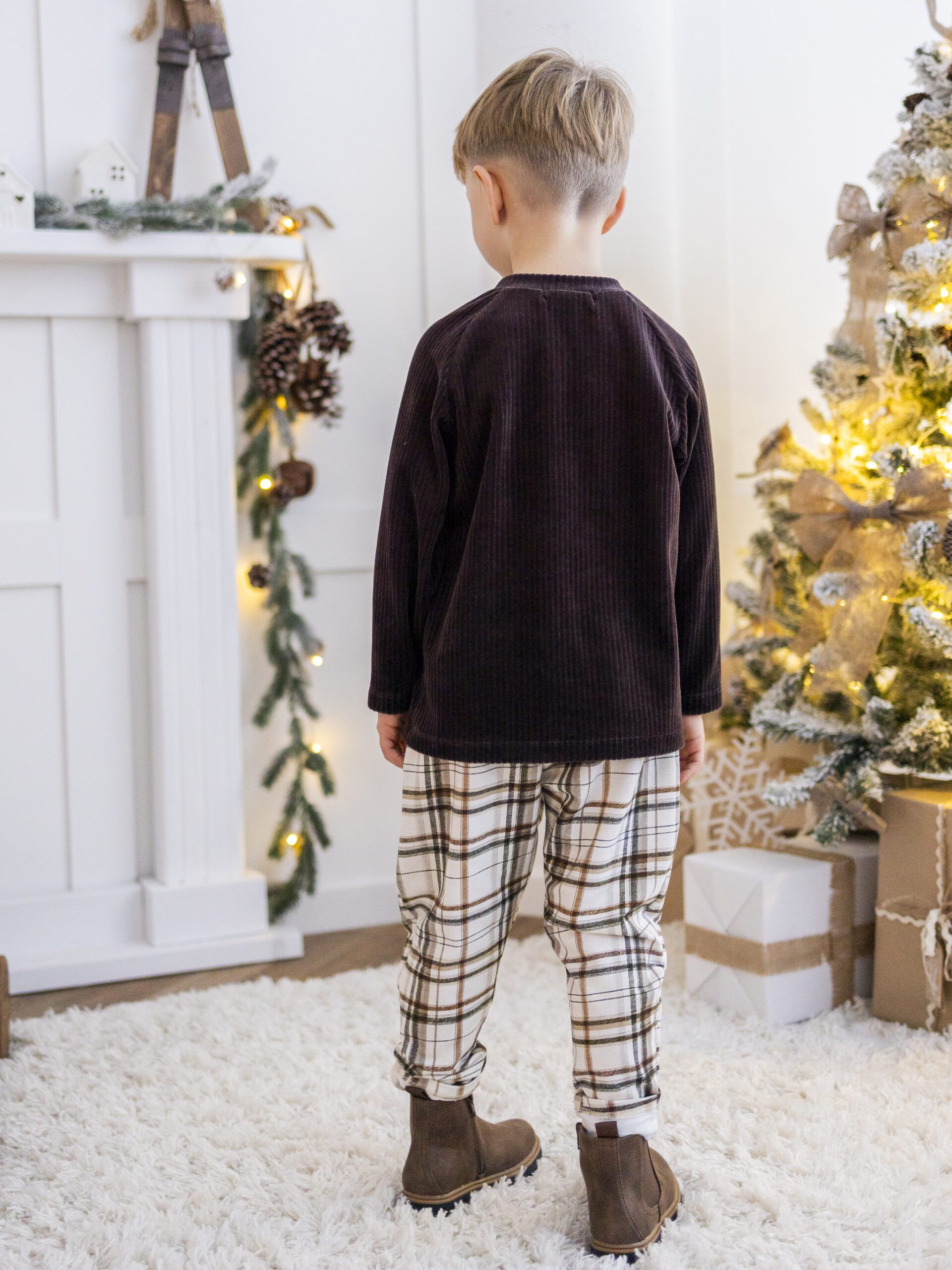 Ten komplet chłopięcy doskonale sprawdzi się jako strój świąteczny, zimowy outfit do przedszkola, szkoły czy rodzinnych sesji zdjęciowych. Połączenie głębokiego brązu z modną kratą tworzy elegancką i przytulną stylizację, która wpisuje się w najnowsze trendy dziecięcej mody.