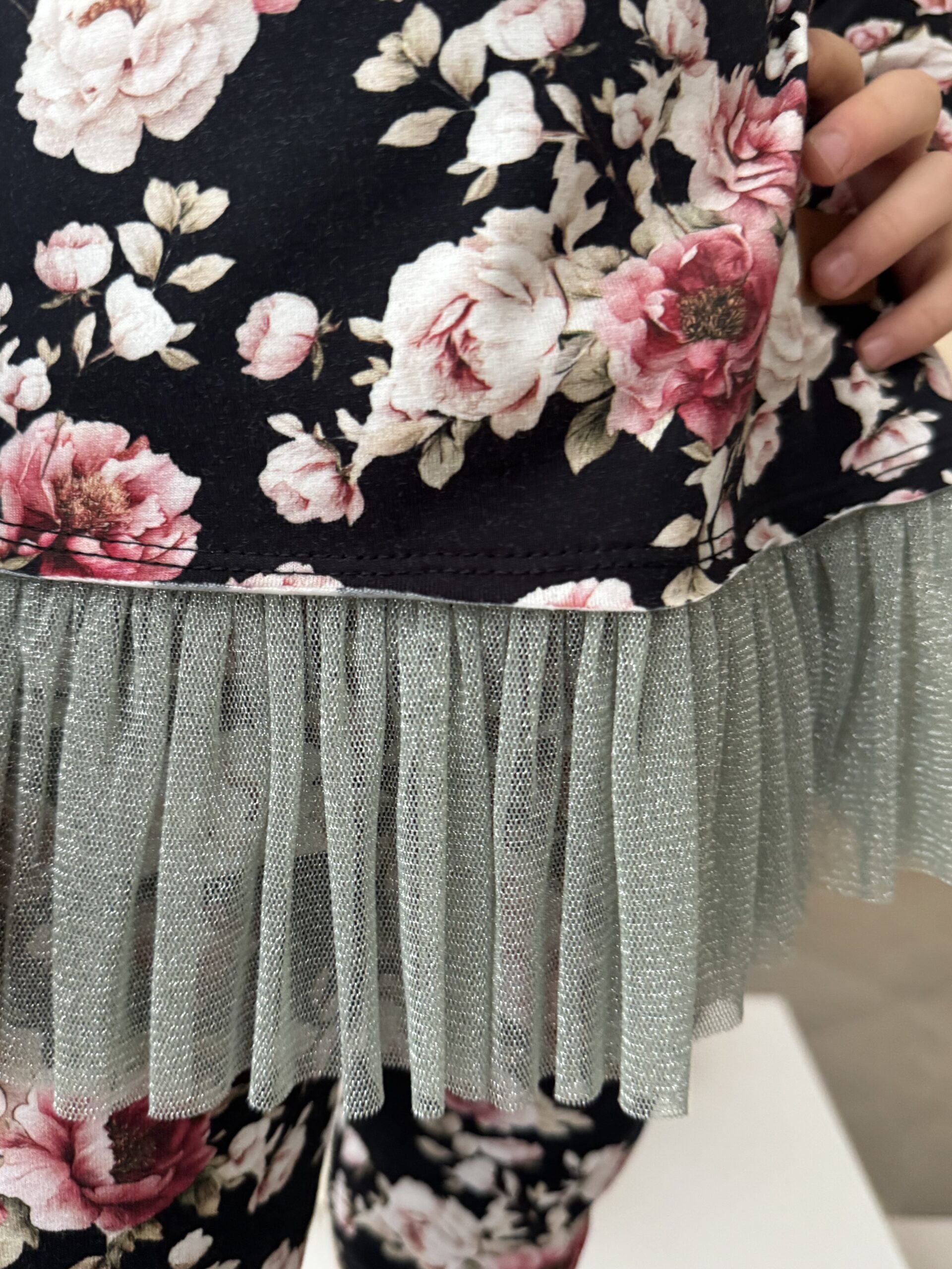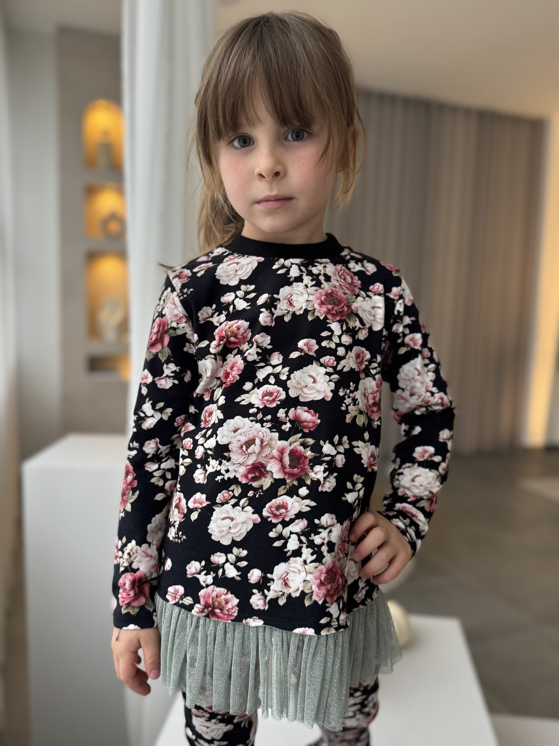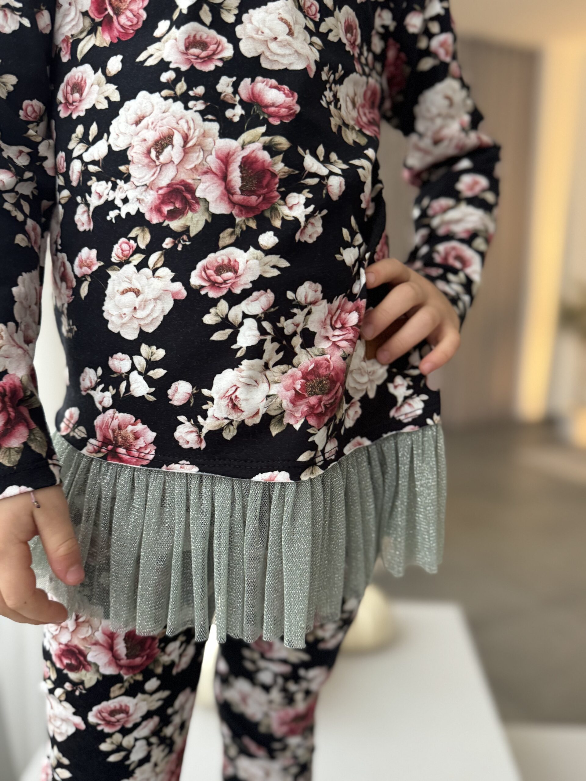 Odkryj naszą wyjątkową koszulkę z tiulem dla dziewczynki w piękny print kwiatowy, wykonaną z najwyższej jakości jerseyu z certyfikatem Oeko-Tex. Ta koszulka to doskonałe połączenie mody dziecięcej i praktyczności, które z pewnością zachwyci każdą małą damę.