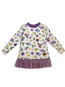 Odkryj naszą wyjątkową koszulkę z tiulem dla dziewczynki w piękny print kwiatowy, wykonaną z najwyższej jakości jerseyu z certyfikatem Oeko-Tex. Ta koszulka to doskonałe połączenie mody dziecięcej i praktyczności, które z pewnością zachwyci każdą małą damę.