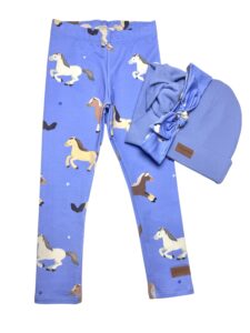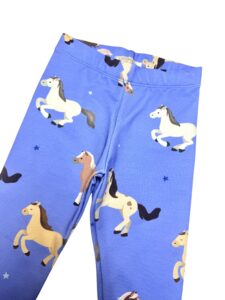 Legginsy dziecięce z dresówki premium z autorskim nadrukiem cyfrowym KONIKI niebieskie- Bestseller, Certyfikat OEKO-TEX®