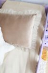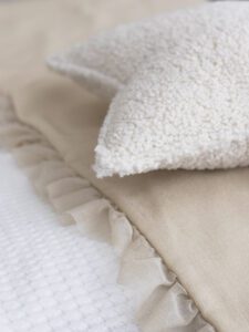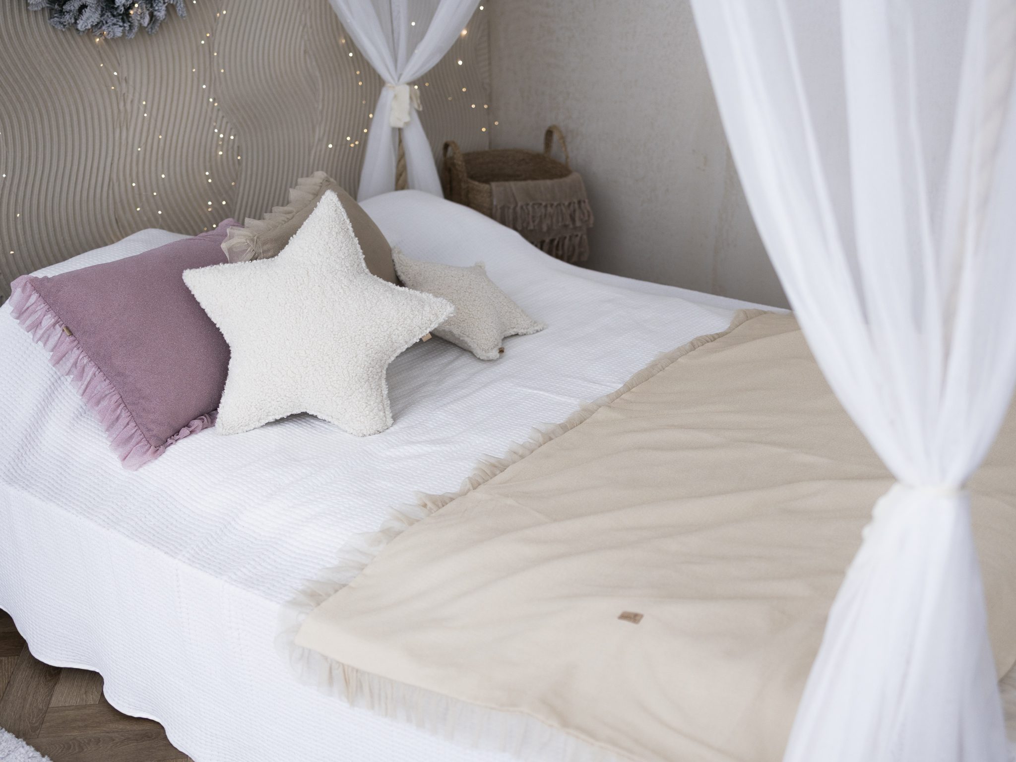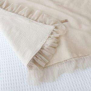 - Komfort i jakość: Narzuta uszyta jest z delikatnego muślinu z bawełnianym ociepleniem, co zapewnia jej lekkość i przewiewność. Ozdobiona miękkim tiulem. Wszystkie tkaniny mają niezbędne certyfikaty bezpieczeństwa – to spokój dla Twojej głowy.