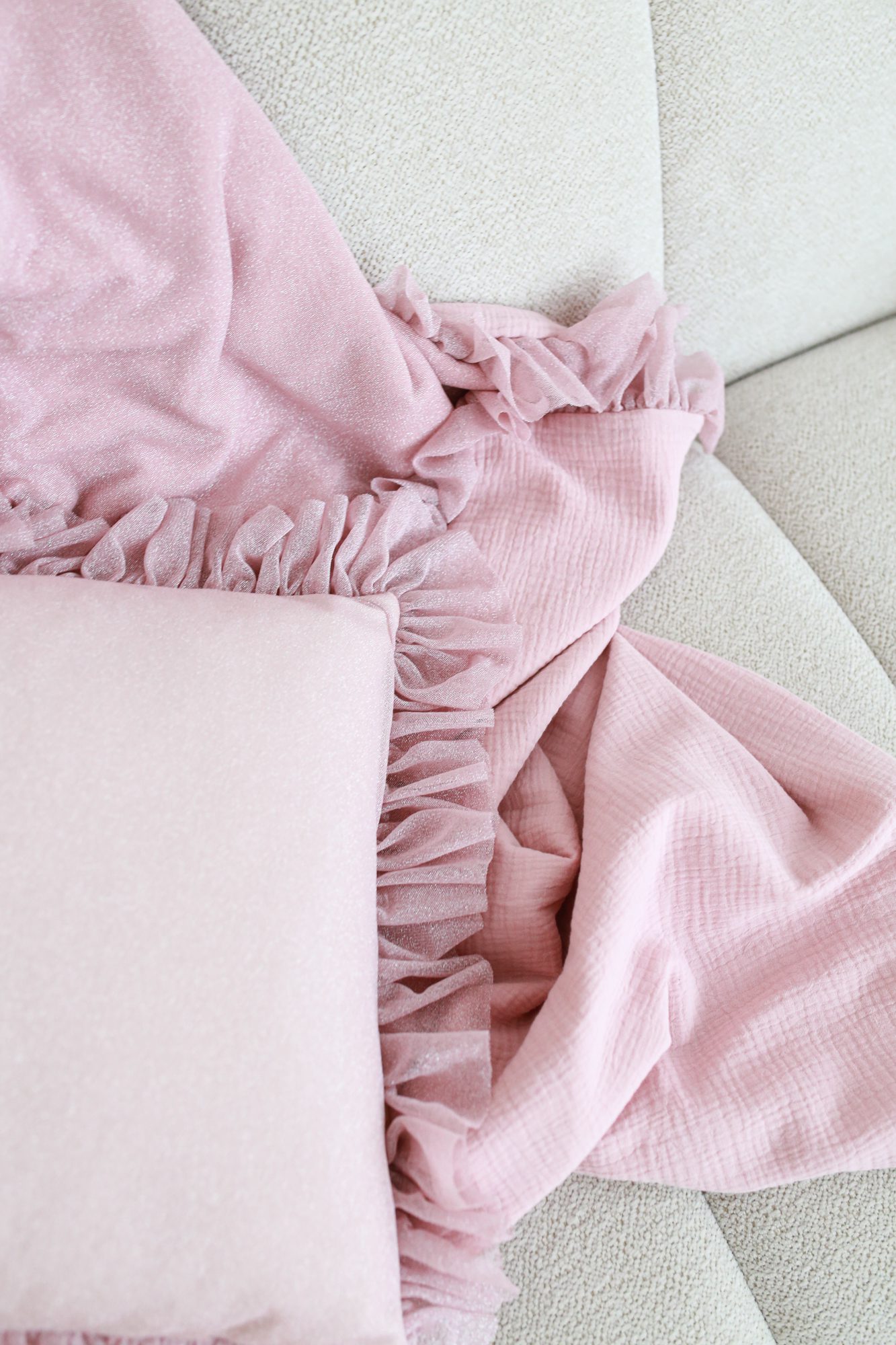 - Dla miłośniczek brokatu… i minimalizmu: Narzuta jest błyszcząca i spełnia marzenia o księżniczkach, ale jednocześnie ma minimalistyczną, elegancką formę. Świetnie wygląda solo, ale też bez problemu pasuje do kolorowych poduch i ulubionych pluszaków.