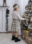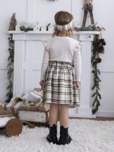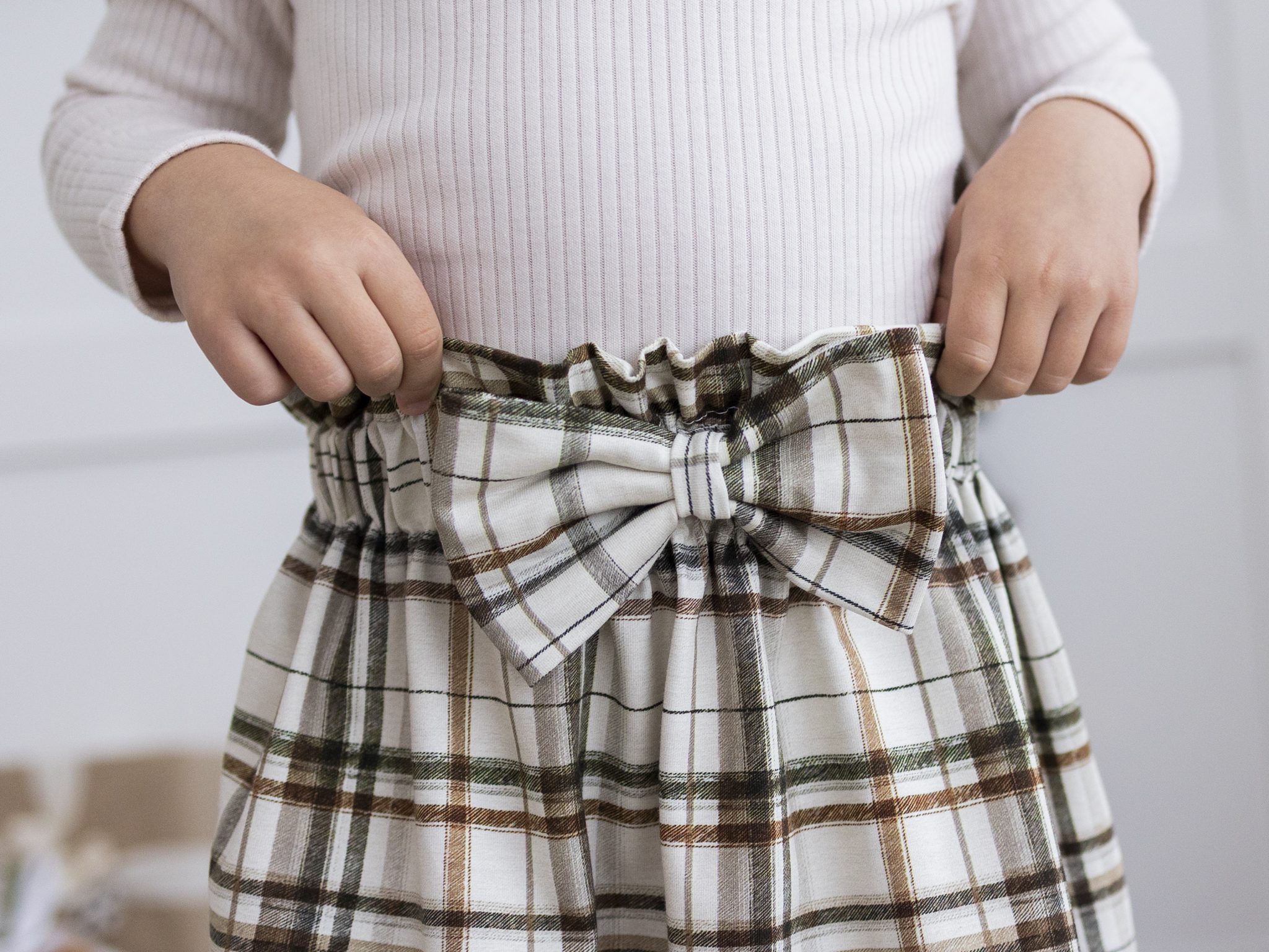 Model dostępny jest w kilku świątecznych wariantach kolorystycznych – klasyczna kratka w odcieniach beżu i zieleni, a także wersja z uroczym świątecznym motywem kwiatowym. Każda spódniczka została ozdobiona dużą, efektowną kokardą z przodu, która dodaje stylizacji elegancji i dziewczęcego uroku.