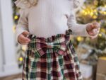 Model dostępny jest w kilku świątecznych wariantach kolorystycznych – klasyczna kratka w odcieniach beżu i zieleni, a także wersja z uroczym świątecznym motywem kwiatowym. Każda spódniczka została ozdobiona dużą, efektowną kokardą z przodu, która dodaje stylizacji elegancji i dziewczęcego uroku.