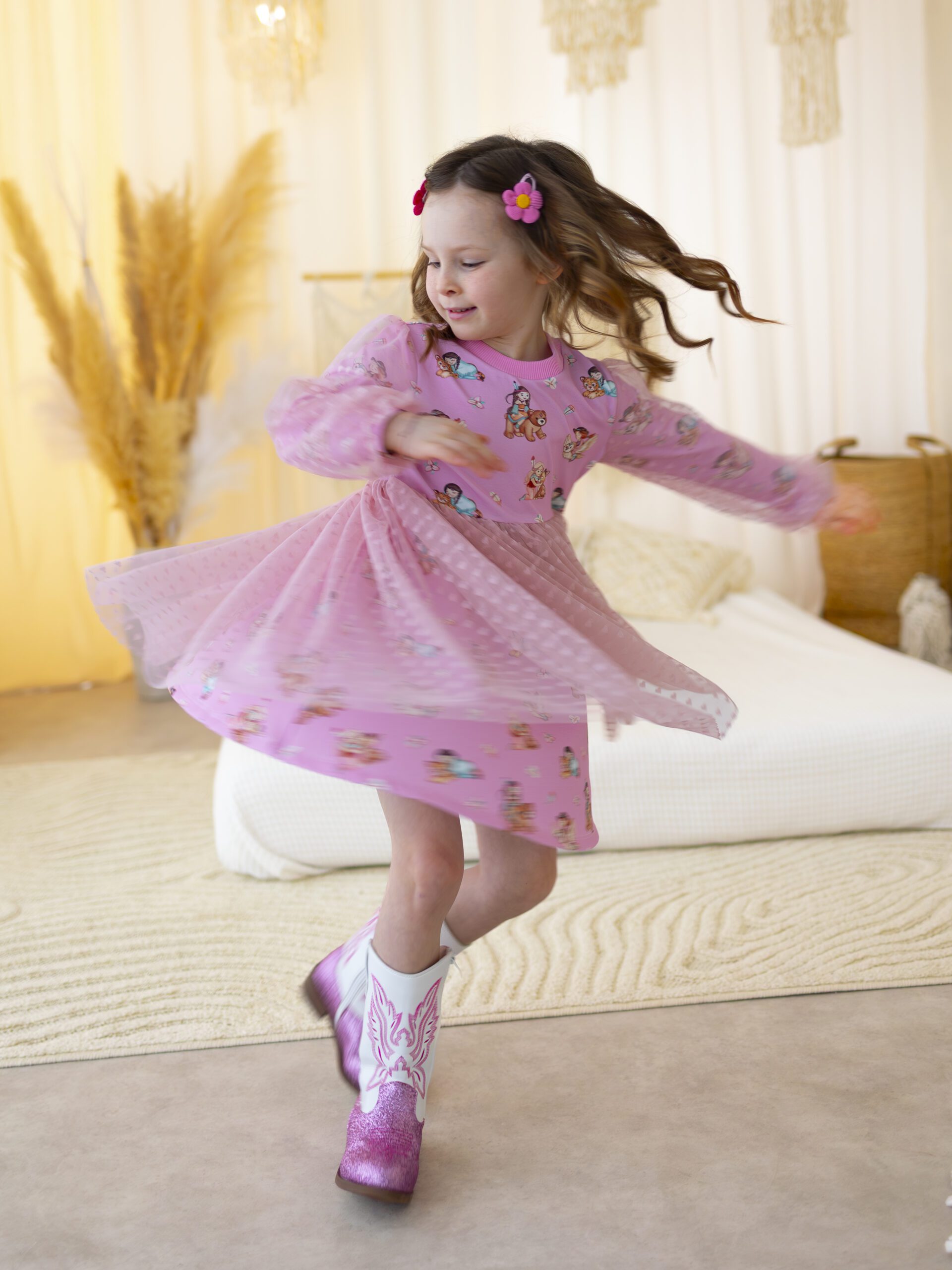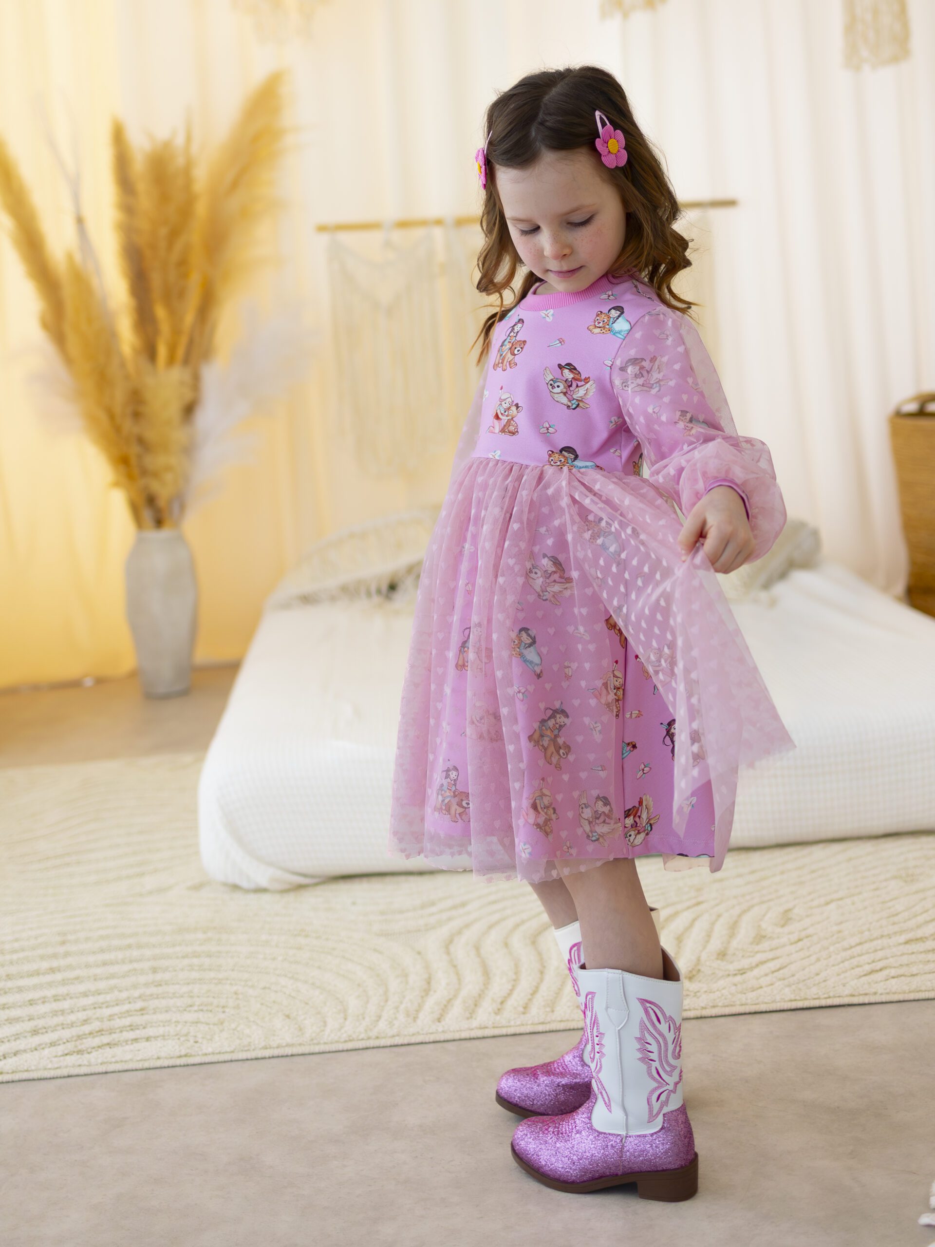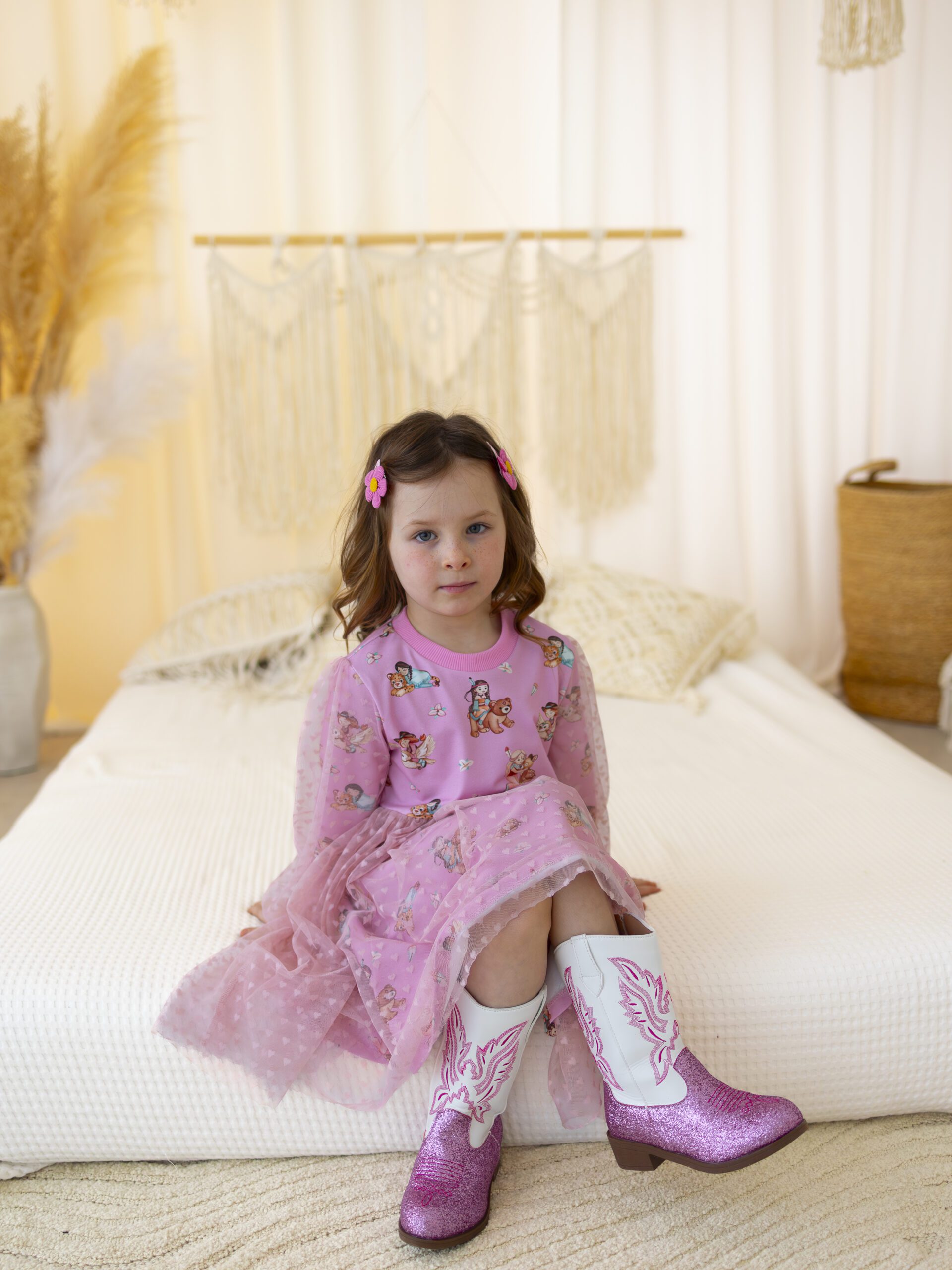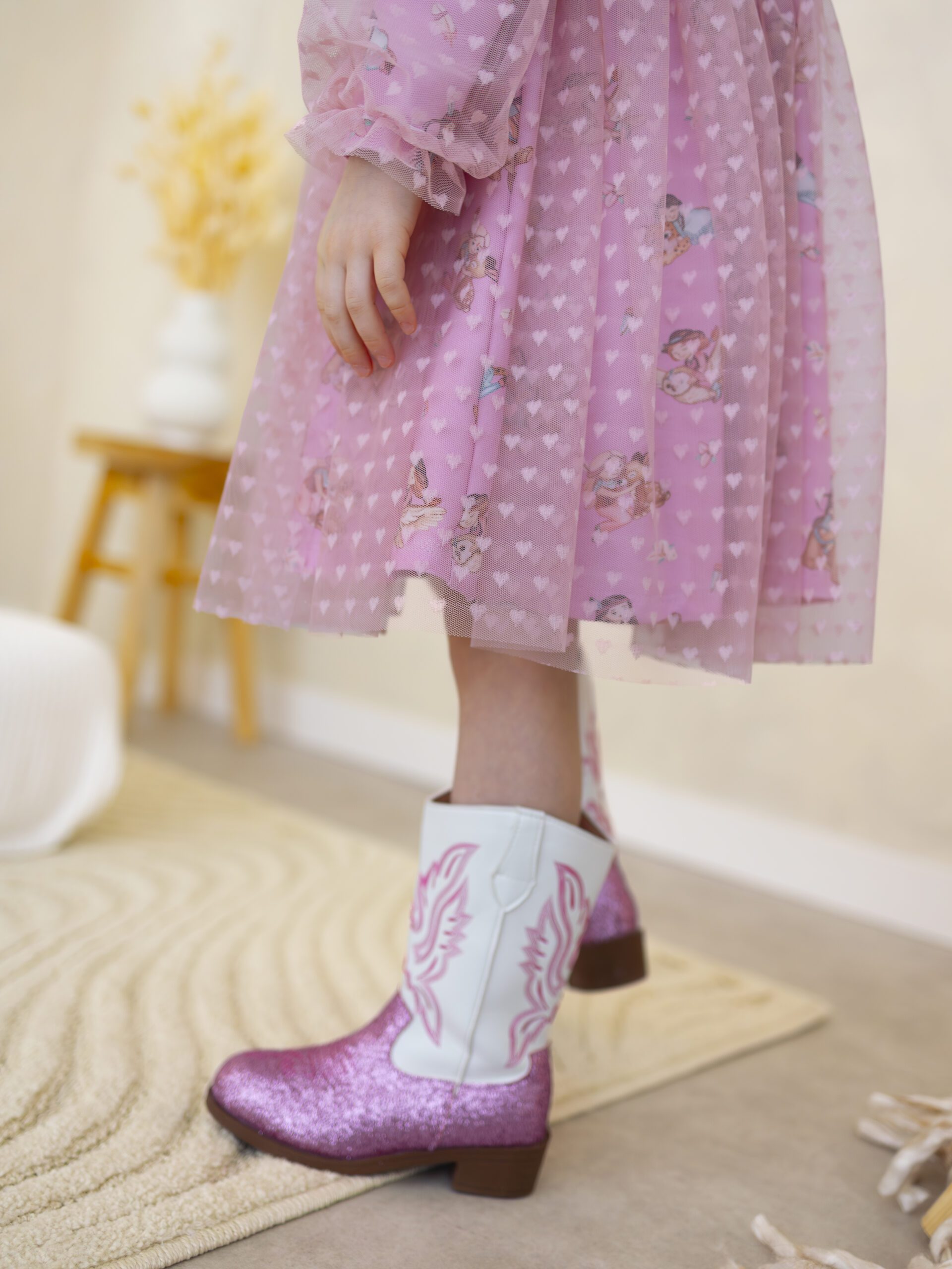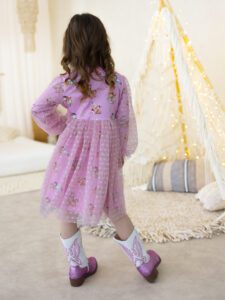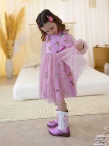 - Tiul, który zachwyca: Sukienka z tiulem brokatowym, który dodaje uroku i sprawia, że sukienka wspaniale się kręci, co uwielbiają wszystkie dziewczynki.