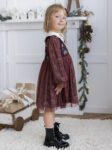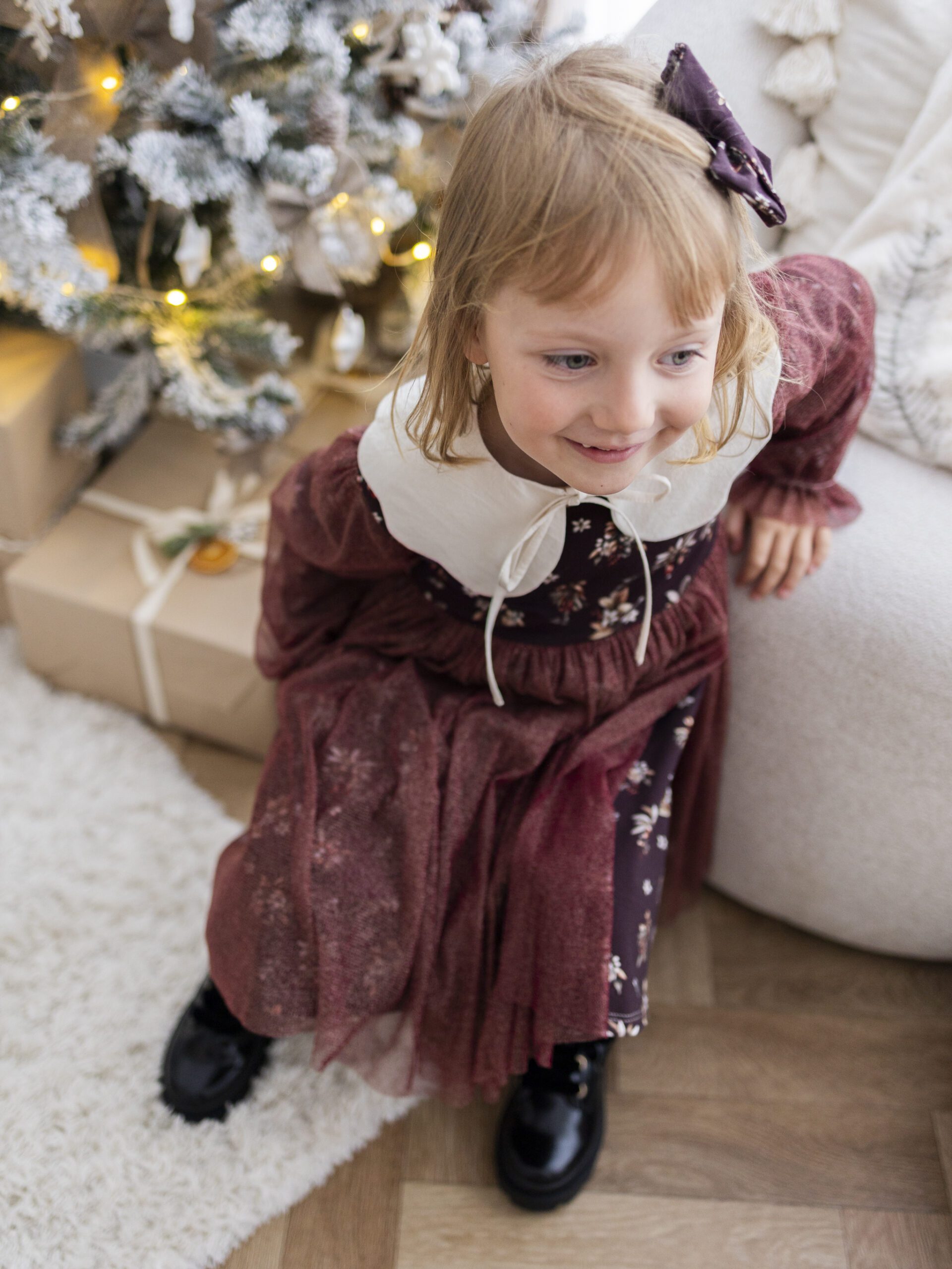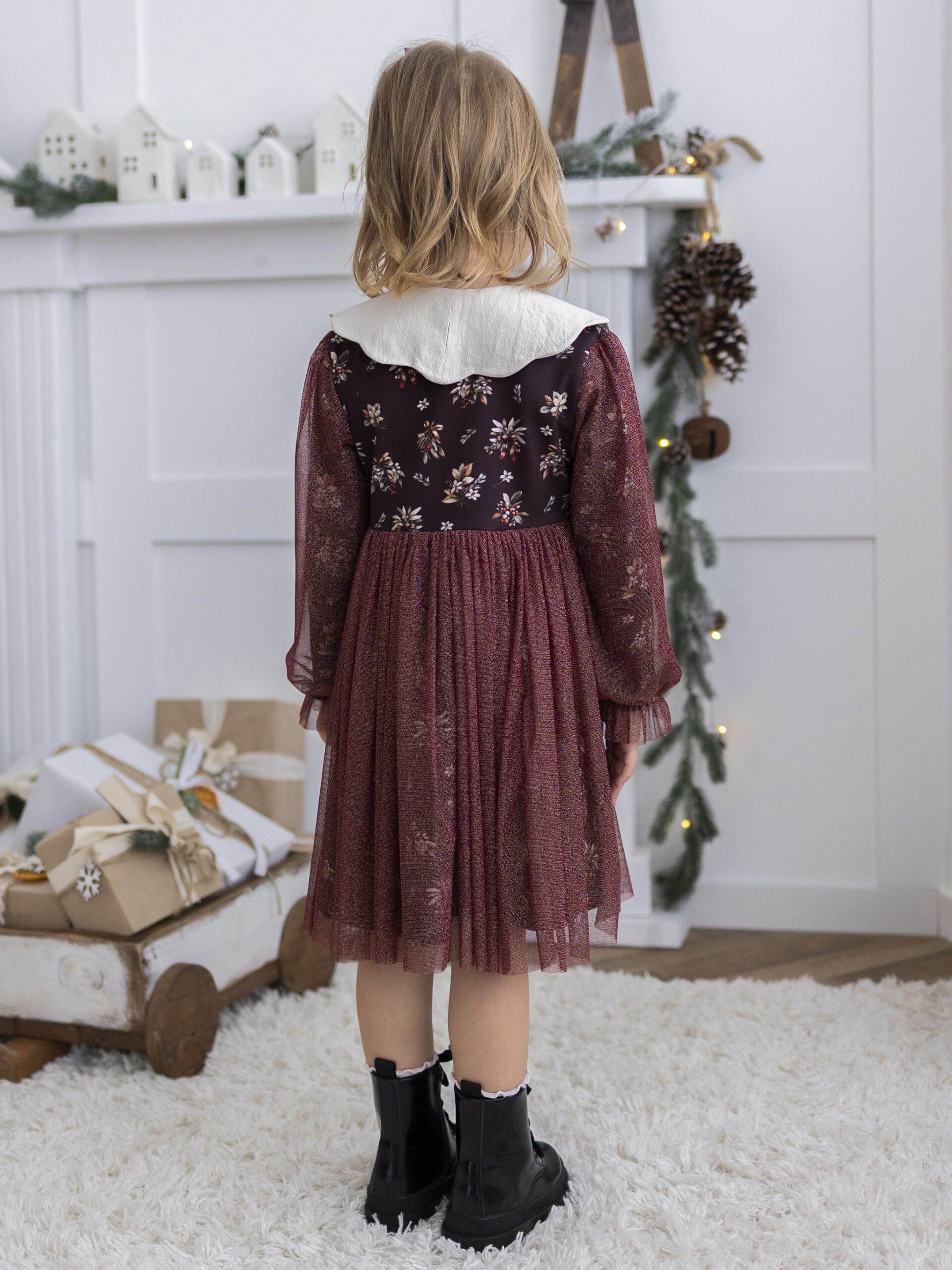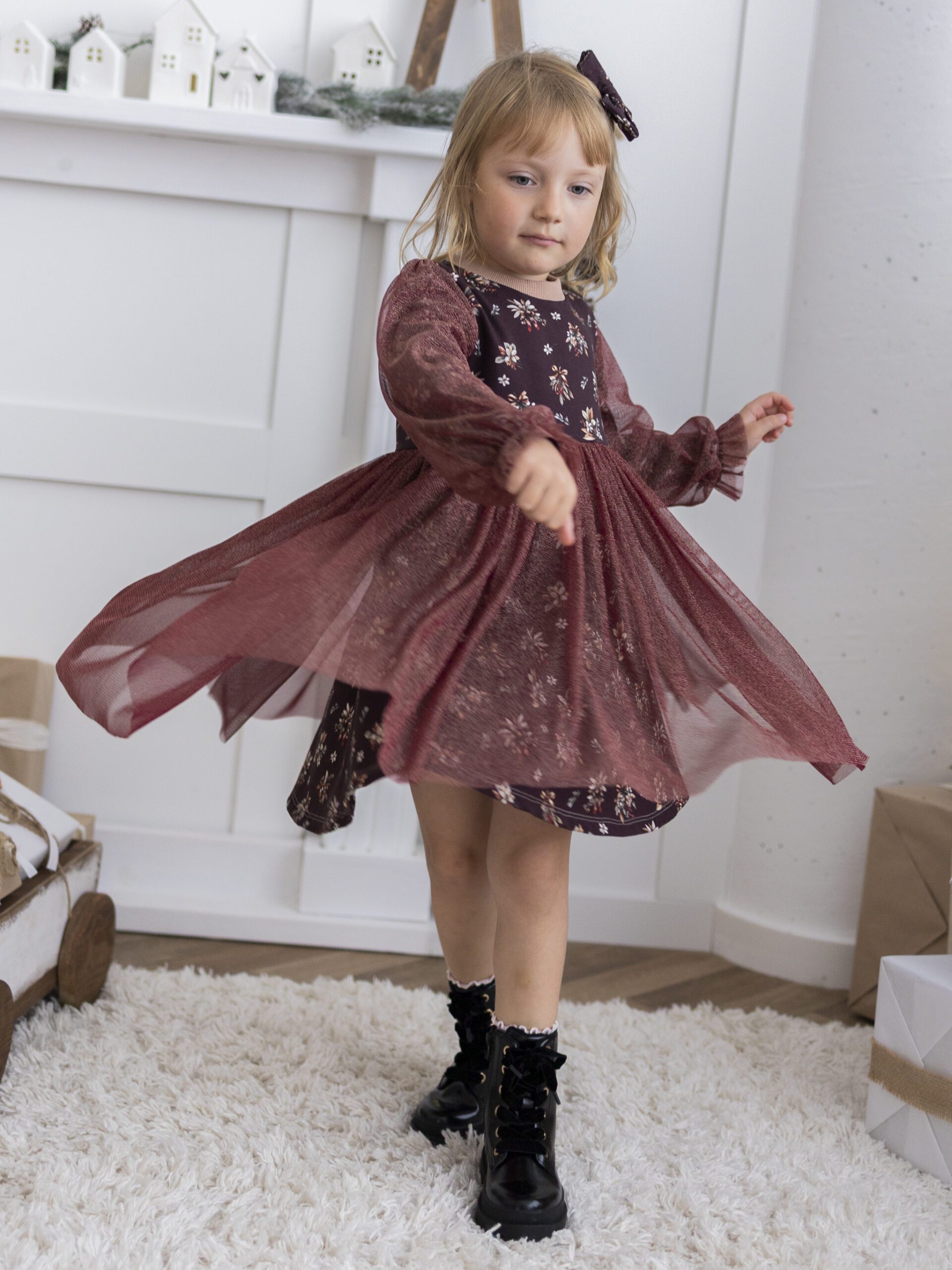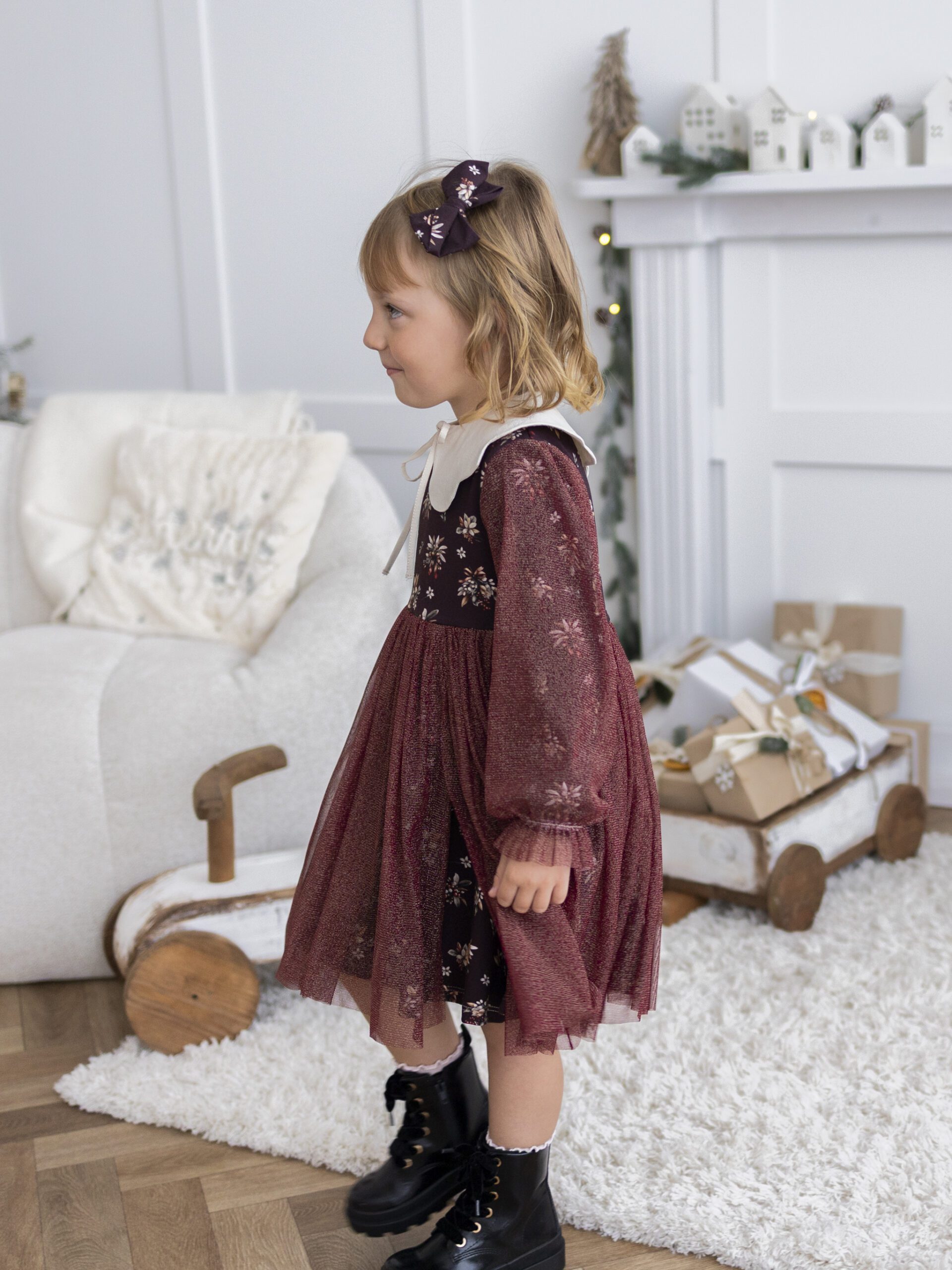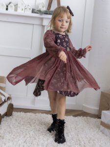 Górna część sukienki wykonana została z miękkiego jerseyu premium, który doskonale dopasowuje się do sylwetki i zapewnia pełen komfort noszenia, nawet podczas długich świątecznych spotkań. Dolna warstwa z lekkim tiulem, delikatnie połyskującym w świetle, tworzy efektowną, kręcącą się spódniczkę – ukochaną przez wszystkie małe księżniczki.