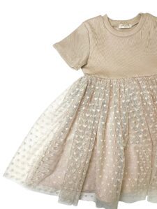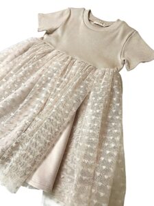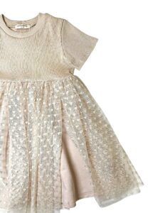 - Tiul, który zachwyca: Sukienka z tiulem, który dodaje uroku i sprawia, że sukienka wspaniale się kręci, co uwielbiają wszystkie dziewczynki.