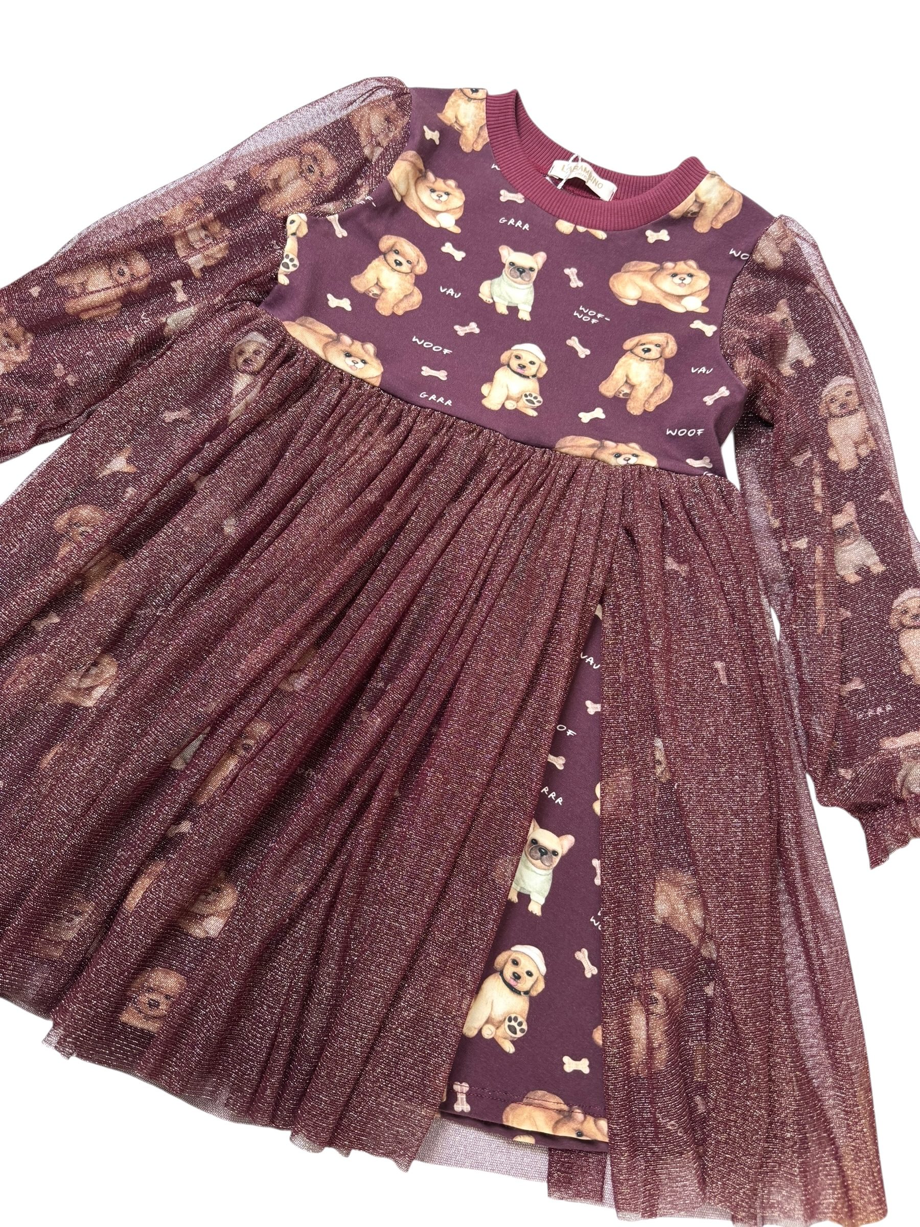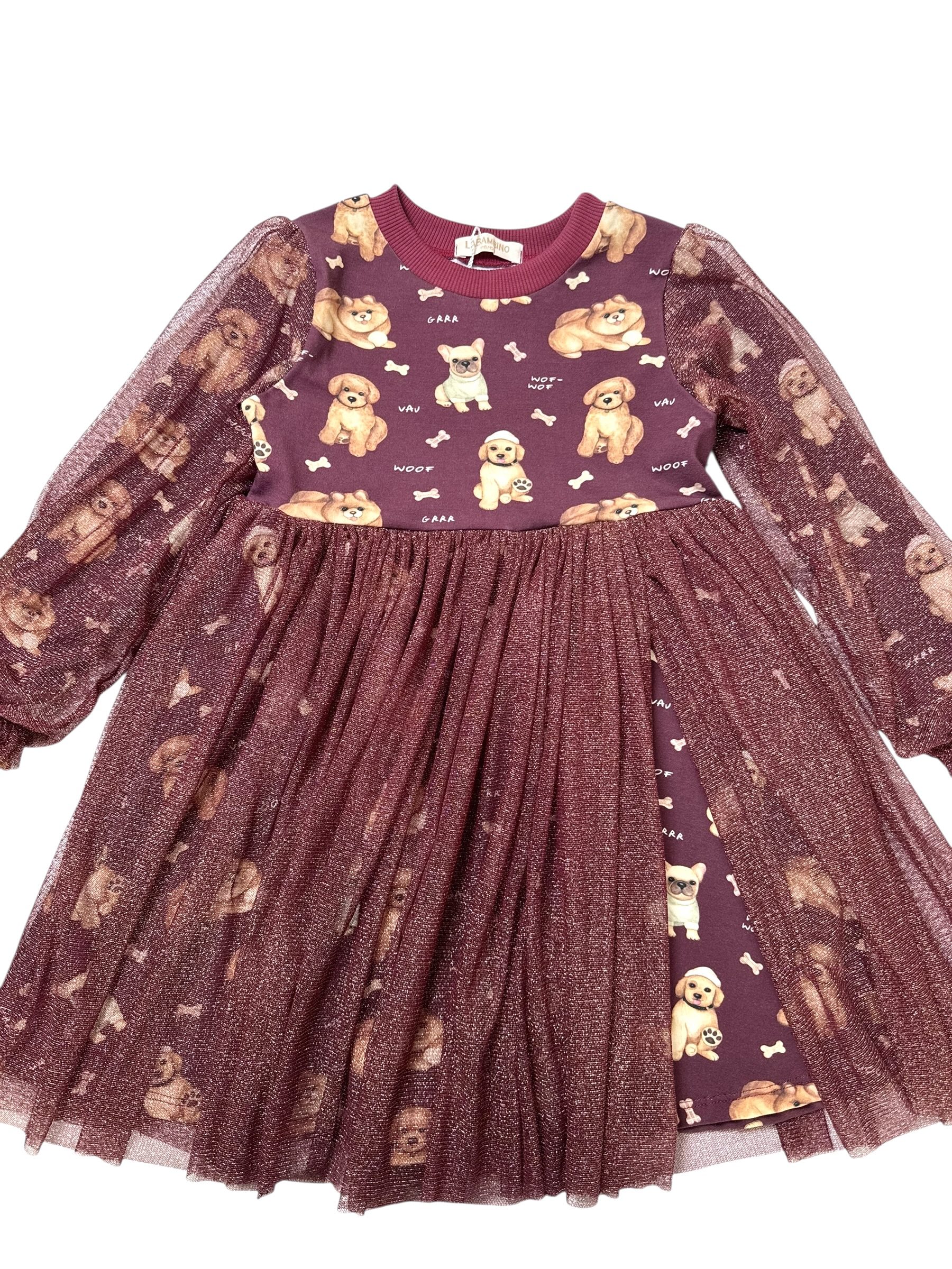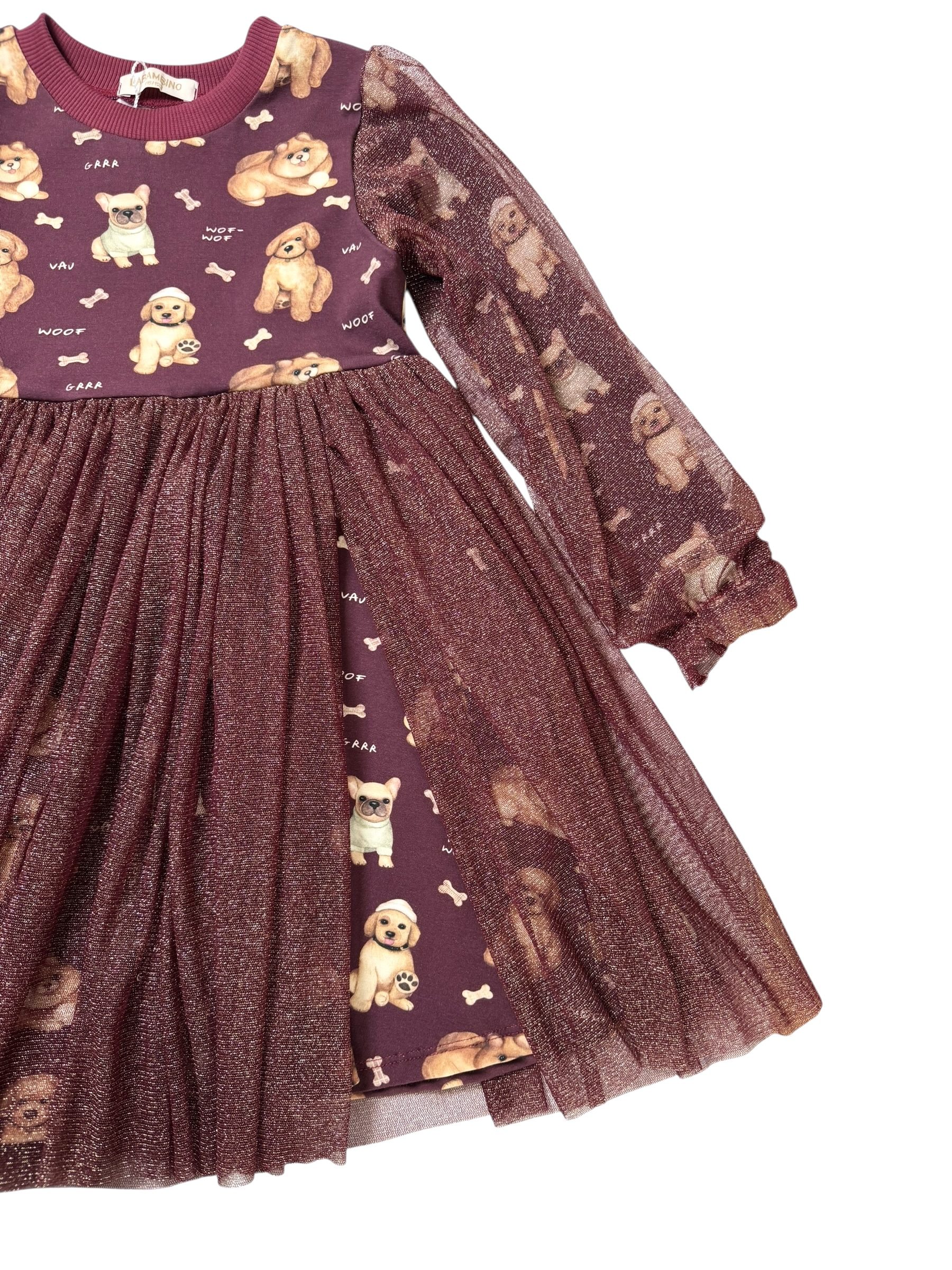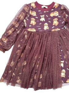 Sukienka dla dziewczynki JAGNA – PIESKI bordo Jersey Premium, Dzianina Prażkowana, Certyfikat OEKO-TEX®