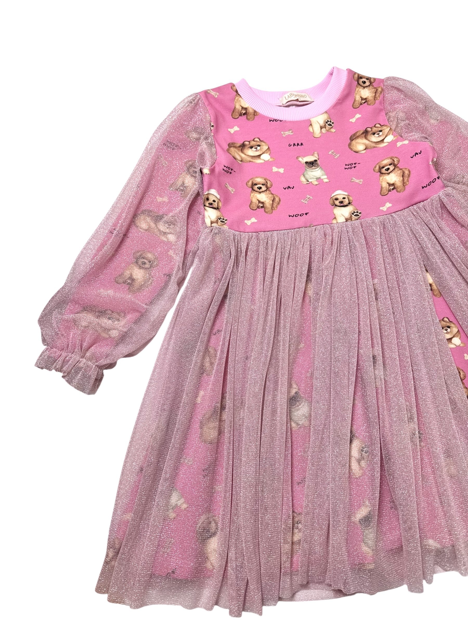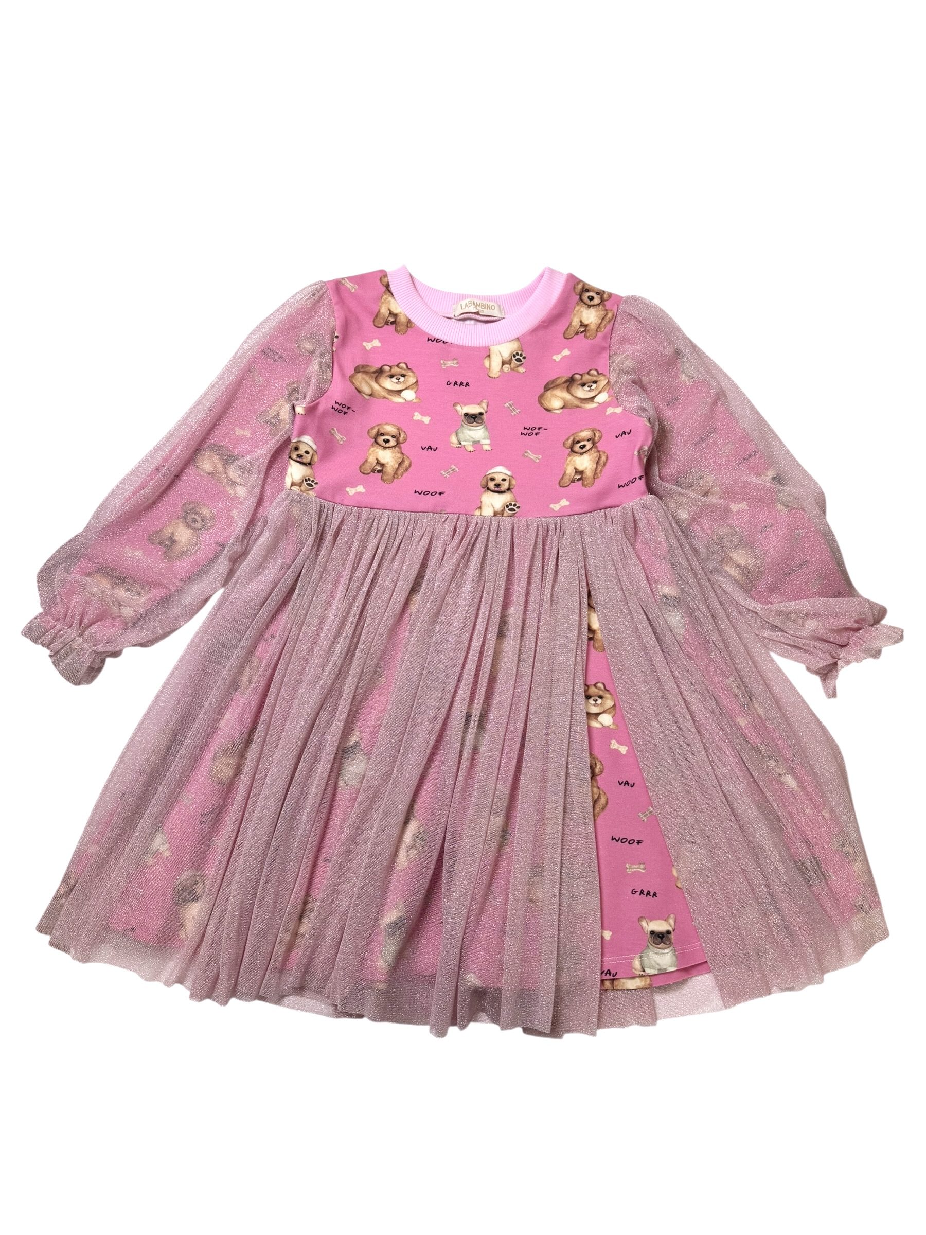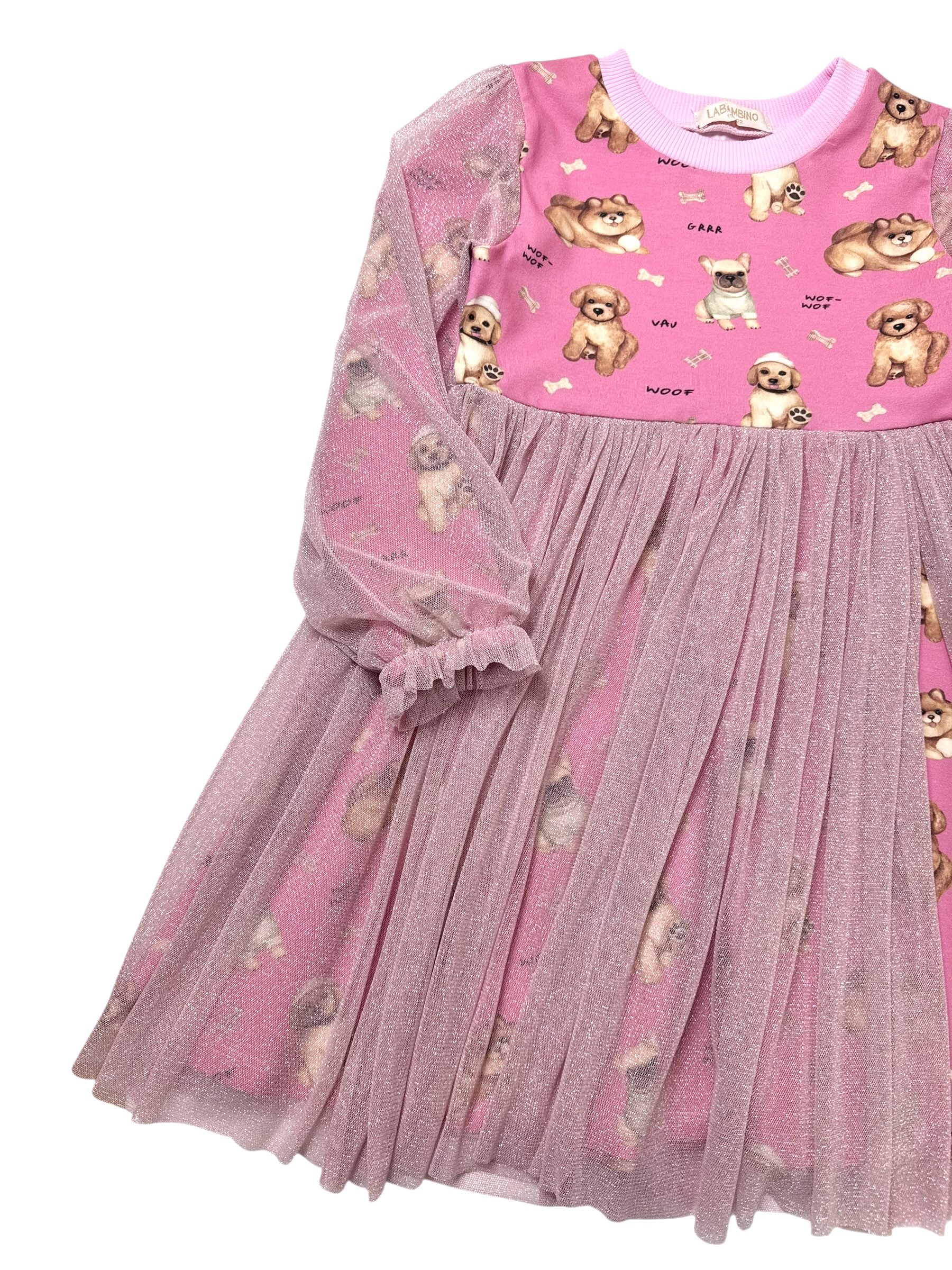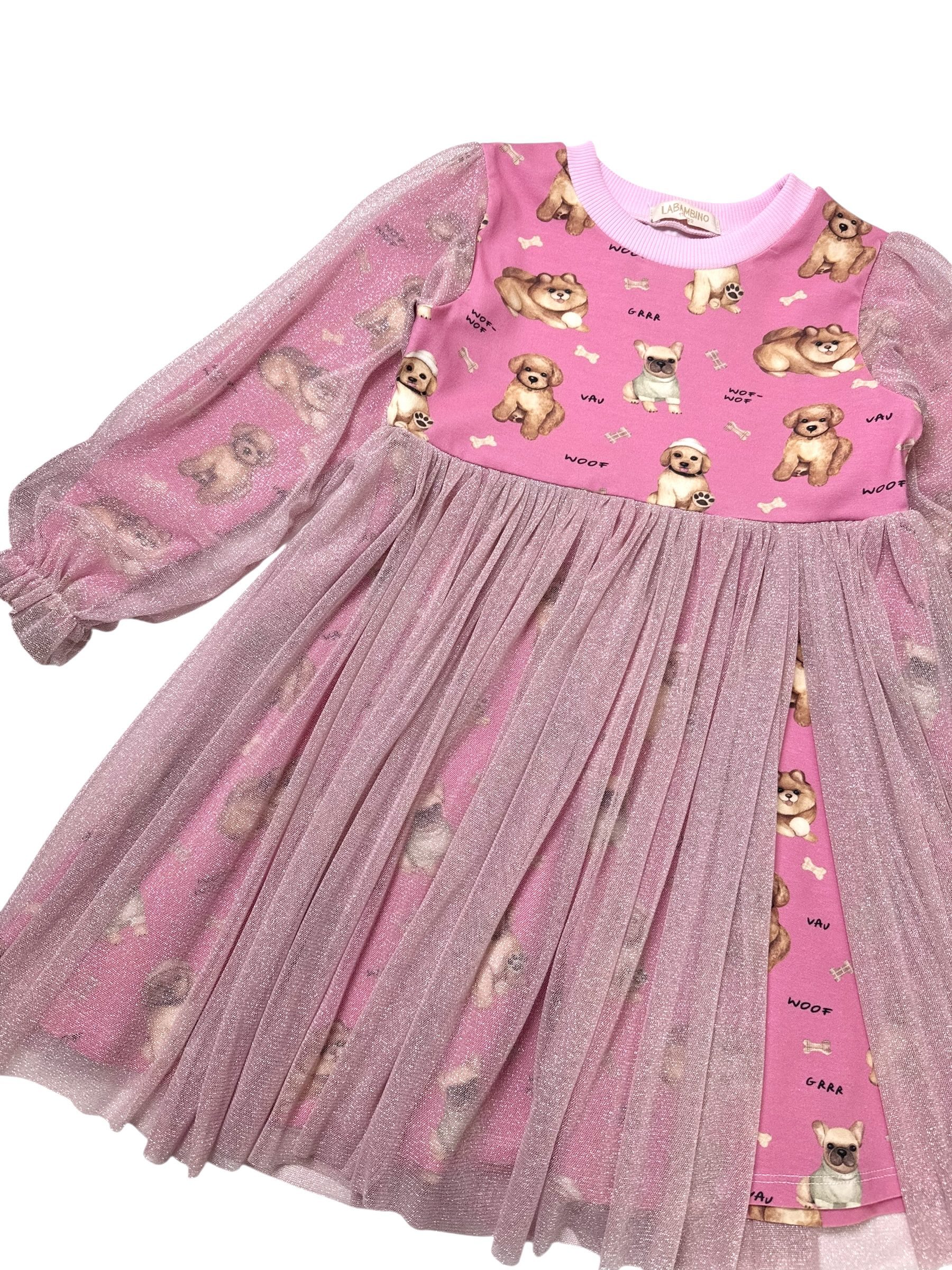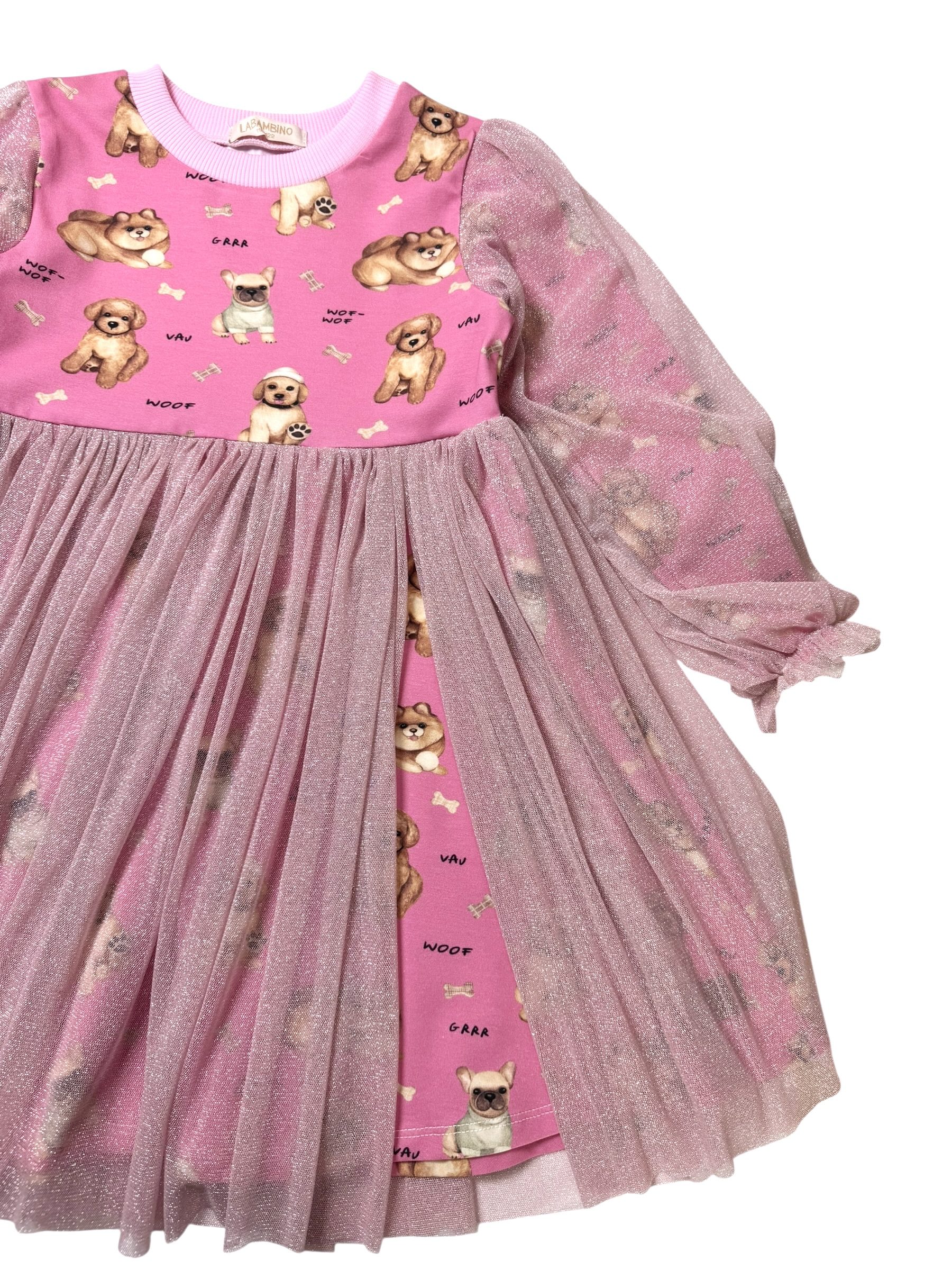 Sukienka dla dziewczynki JAGNA – PIESKI róż Jersey Premium, Dzianina Prażkowana, Certyfikat OEKO-TEX®