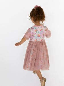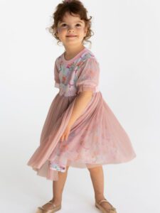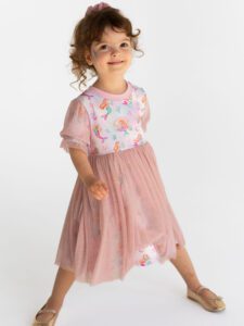 - Tiul, który zachwyca: Sukienka z tiulem brokatowym, który dodaje uroku i sprawia, że sukienka wspaniale się kręci, co uwielbiają wszystkie dziewczynki.