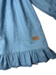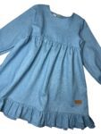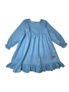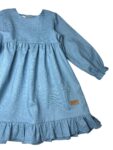 Sukienka została uszyta z wysokogatunkowej tkaniny z certyfikatem OEKO-TEX Standard 100, co gwarantuje bezpieczeństwo i komfort noszenia nawet dla najbardziej wrażliwej skóry dziecka. Miękka, elastyczna tkanina doskonale układa się w ruchu, a delikatne falbanki nadają sukience dziewczęcego wdzięku.