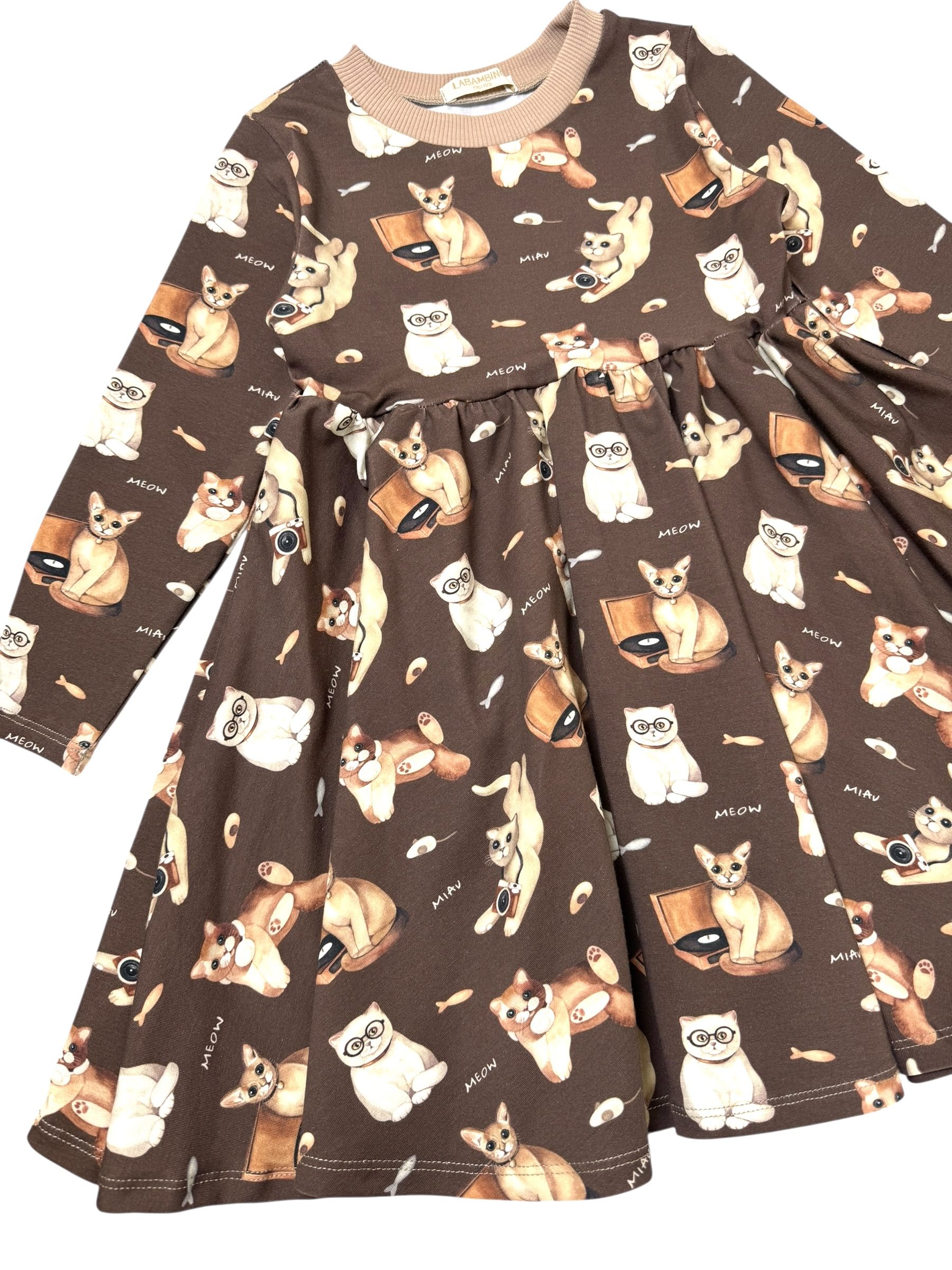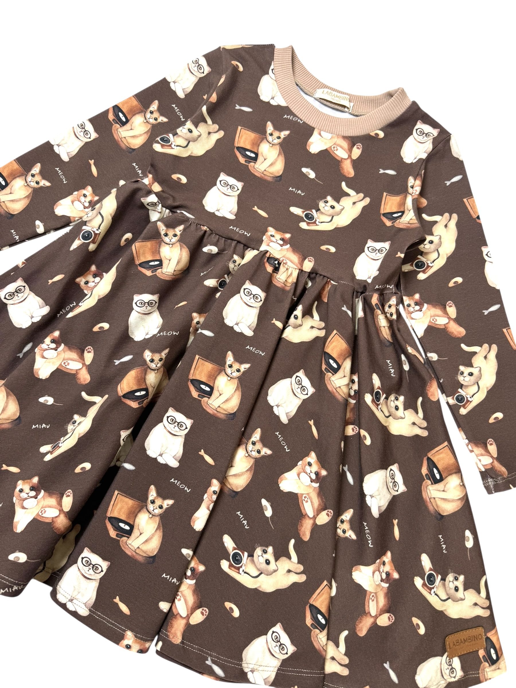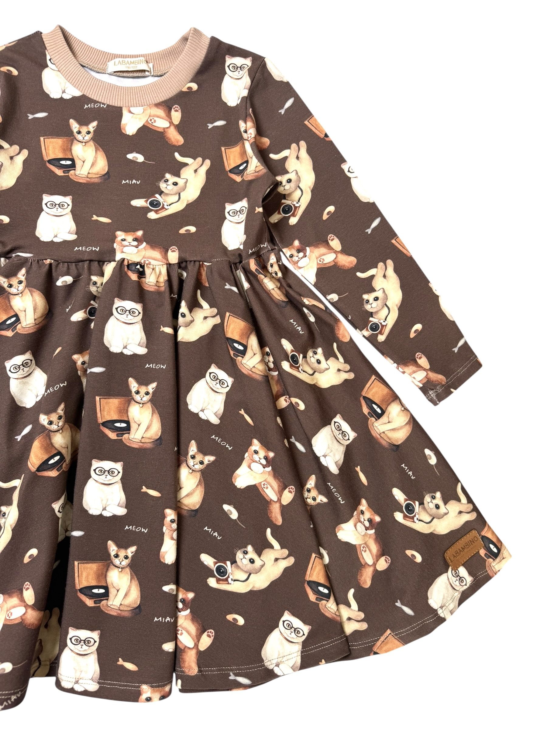 Sukienka dla dziewczynki ZOSIA- KOTKI czekolada – Jersey Premium, Certyfikat OEKO-TEX®