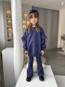 - Modny fason – bluza z falbankami + spodnie dzwony = stylowy look małej fashionistki.