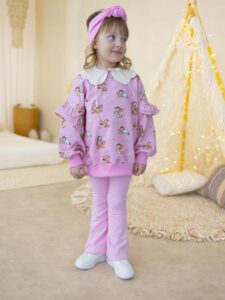 - Modny fason – bluza z falbankami + spodnie dzwony = stylowy look małej fashionistki.