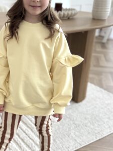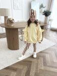 - Modny fason – bluza z falbankami + spodnie dzwony = stylowy look małej fashionistki.
