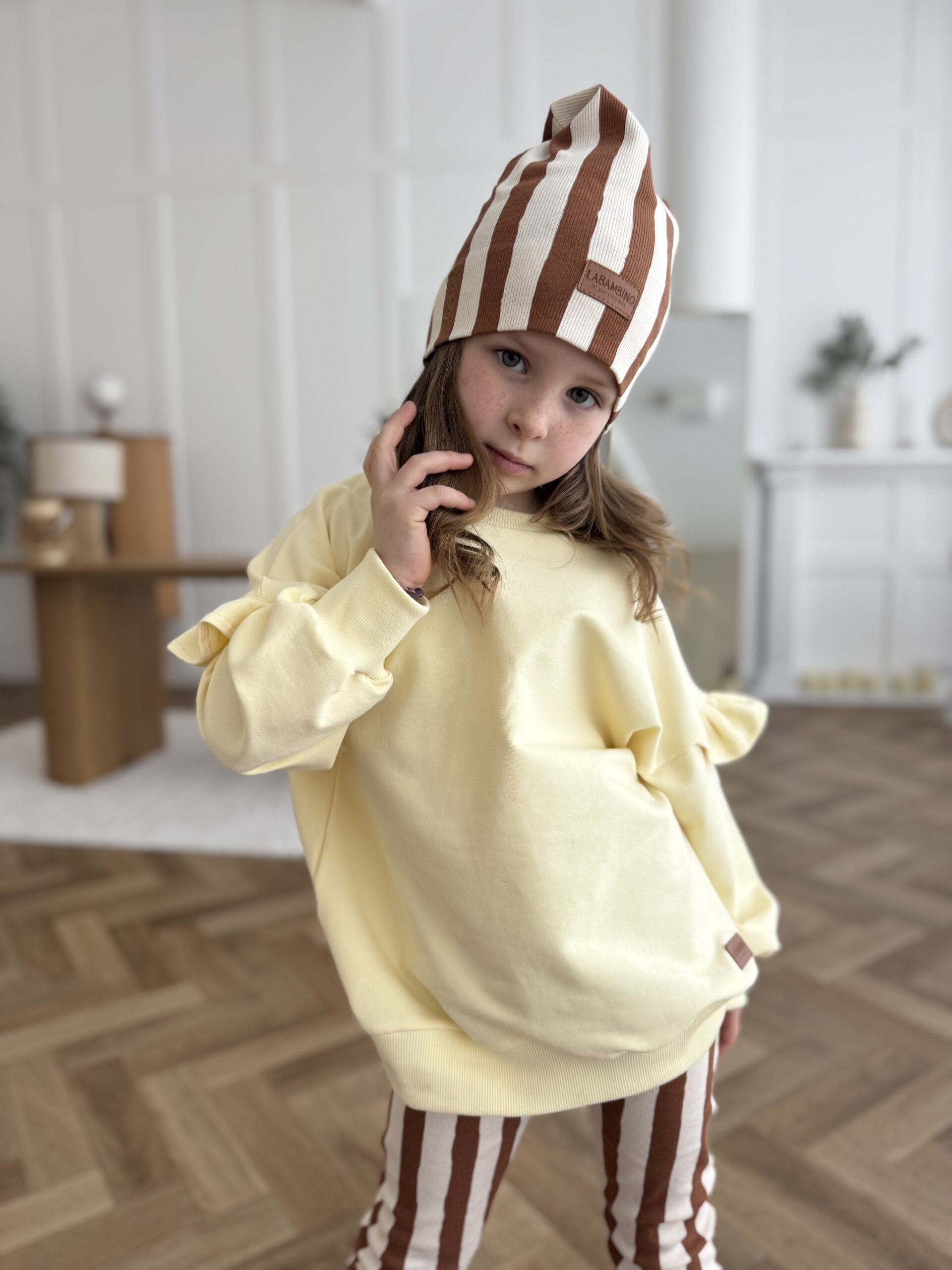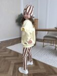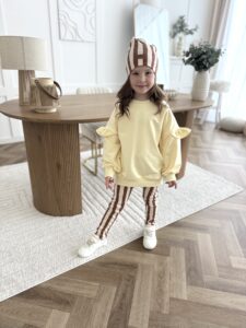 Do kompletu dołączone są spodnie dzwony – absolutny hit sezonu! Elastyczne, miękkie i stylowe, pięknie wydłużają sylwetkę i świetnie układają się podczas ruchu. Zestaw idealny na co dzień, do przedszkola, szkoły, na spacer czy rodzinne wyjścia.