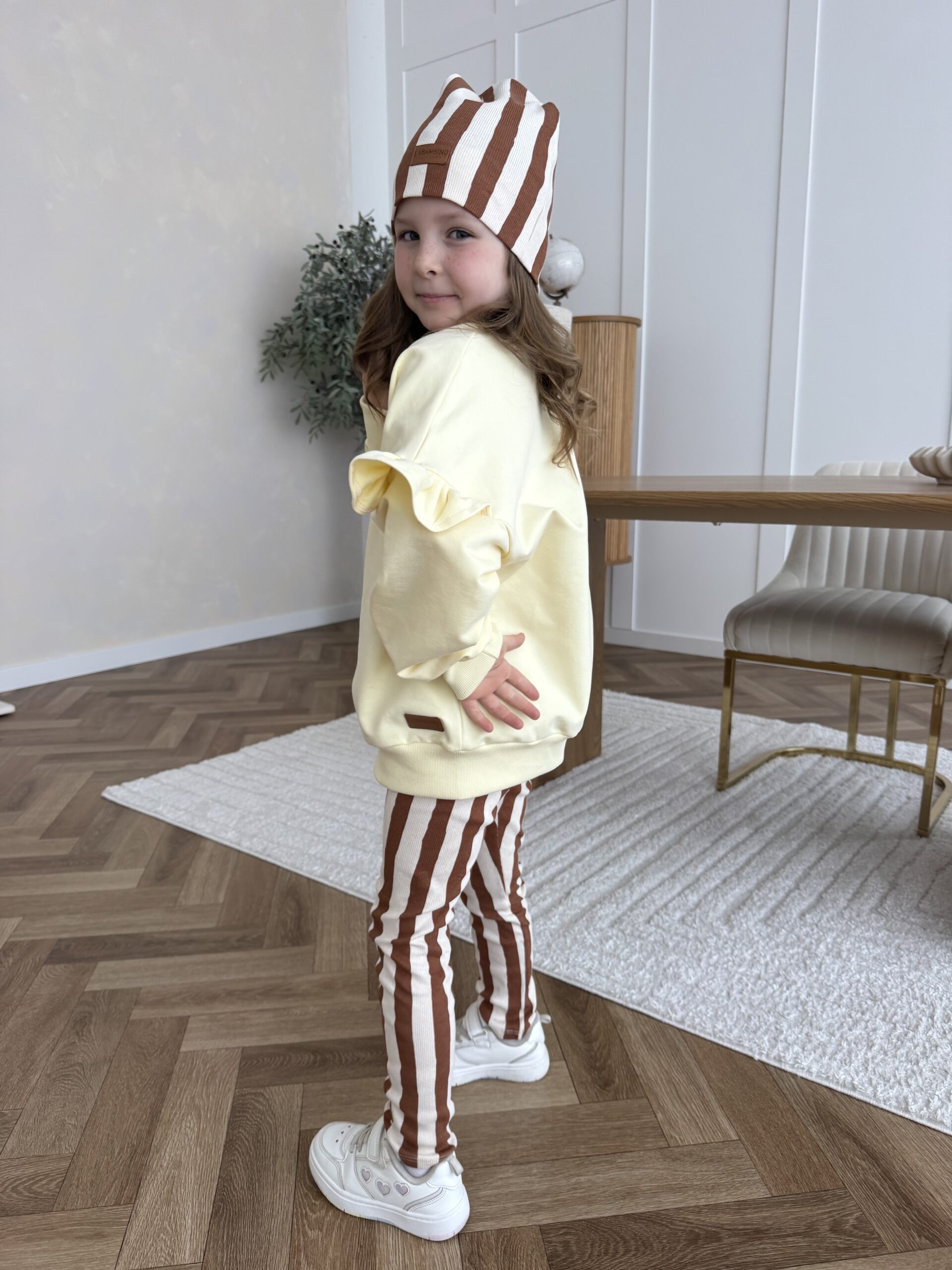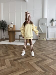 Ten zestaw to połączenie stylu, jakości i komfortu -Zestaw bluza falbanka MASEŁKO i legginsy PASKI must have w szafie każdej dziewczynki!