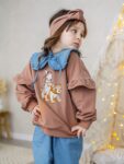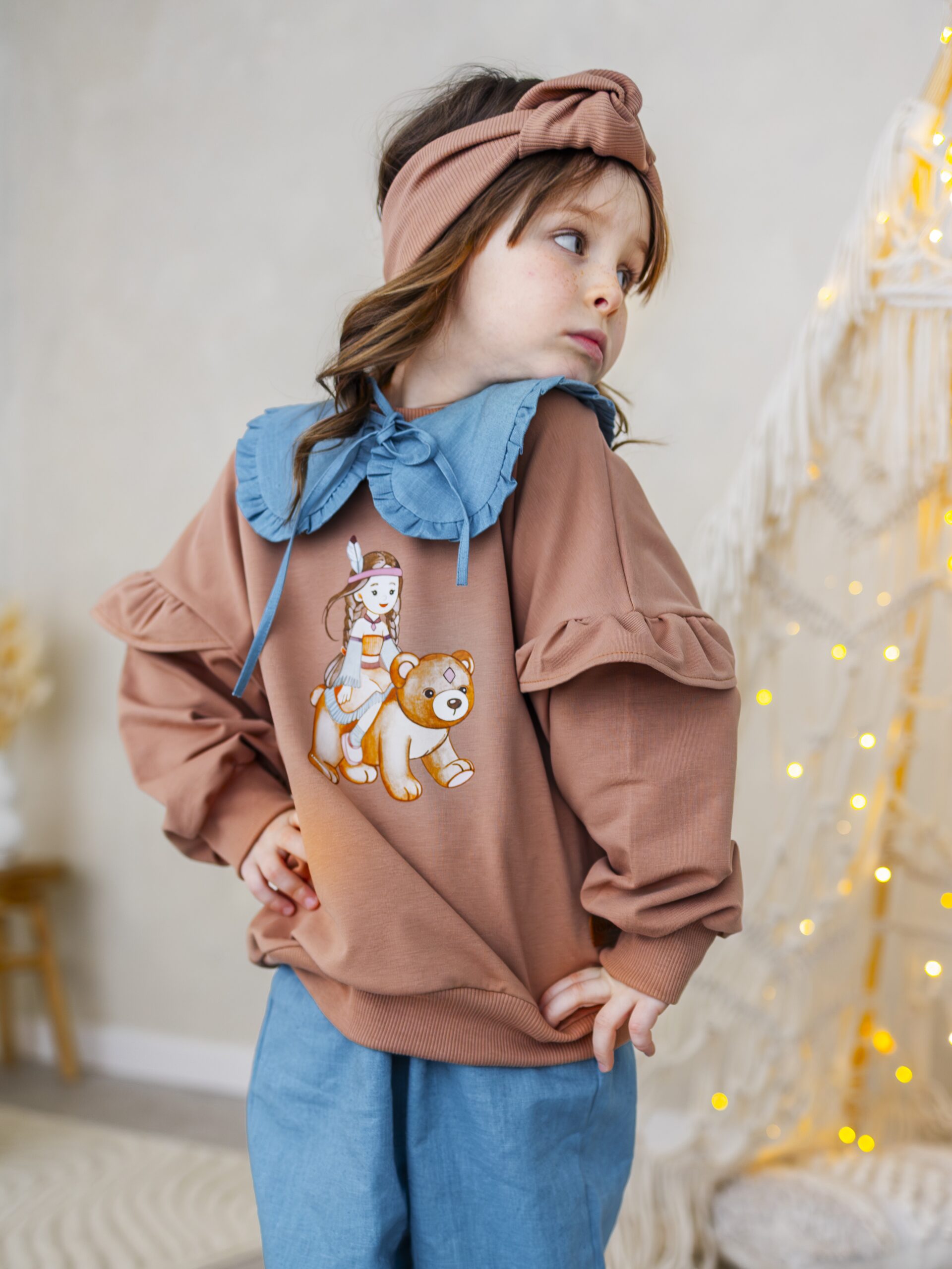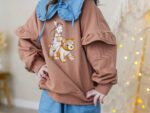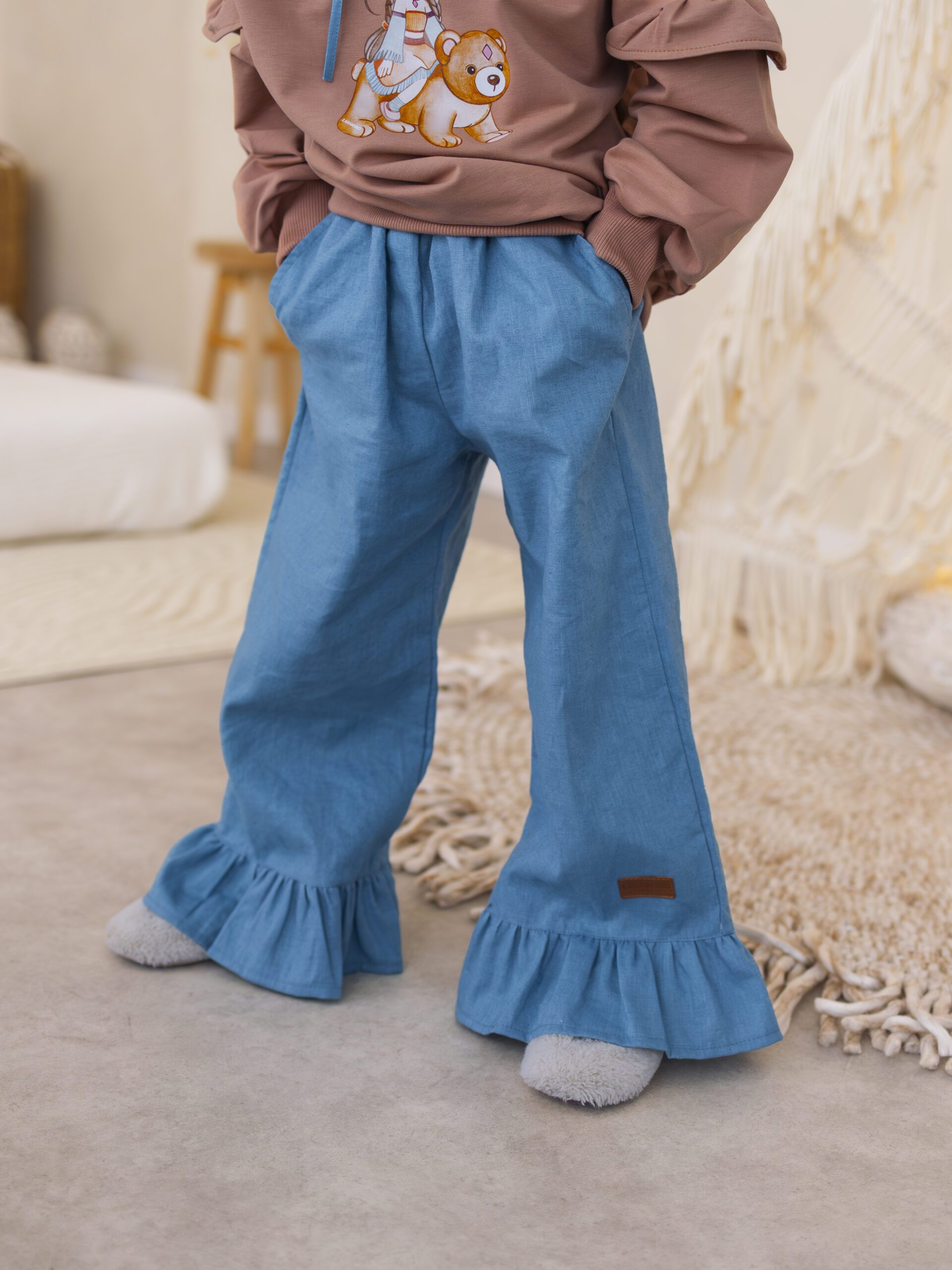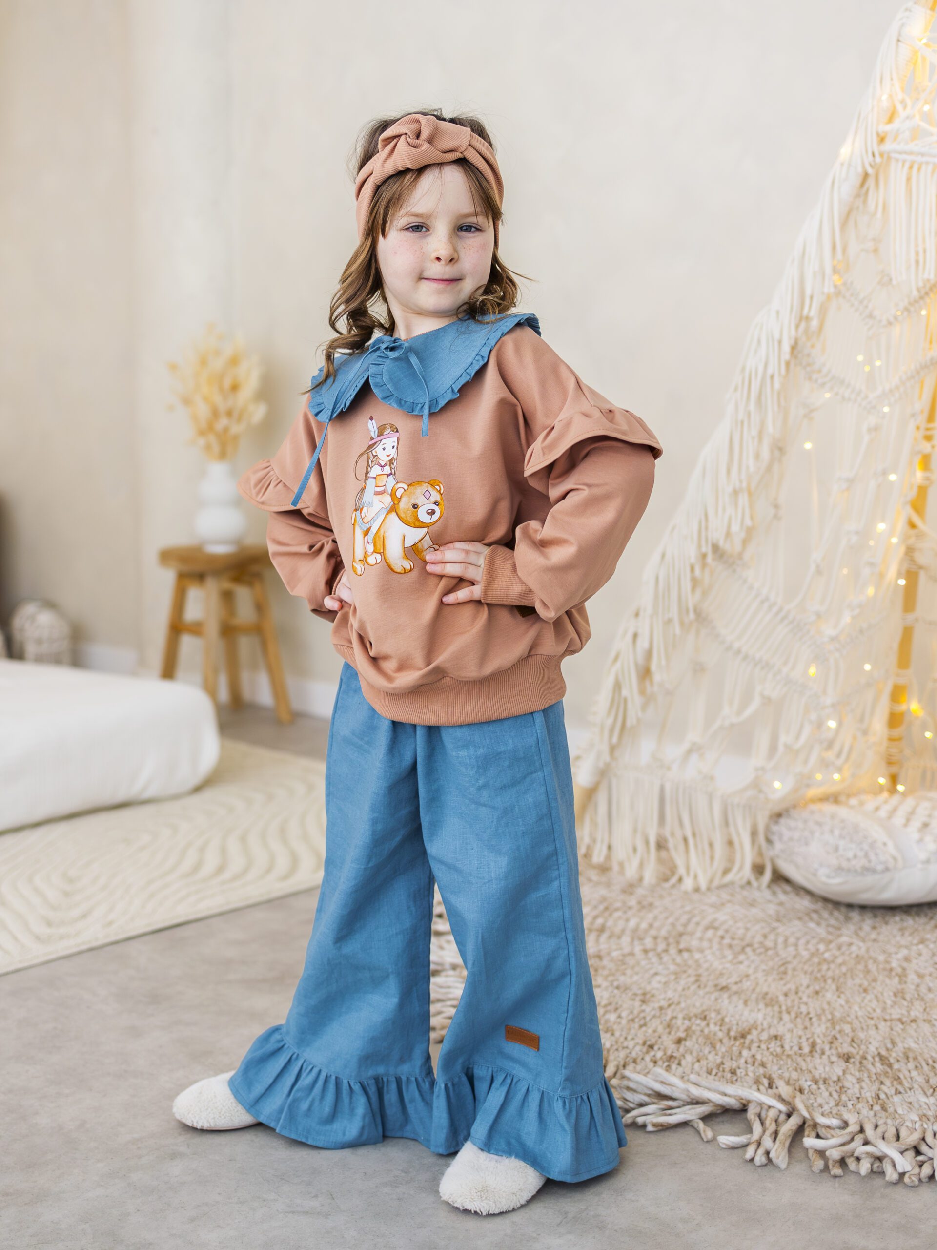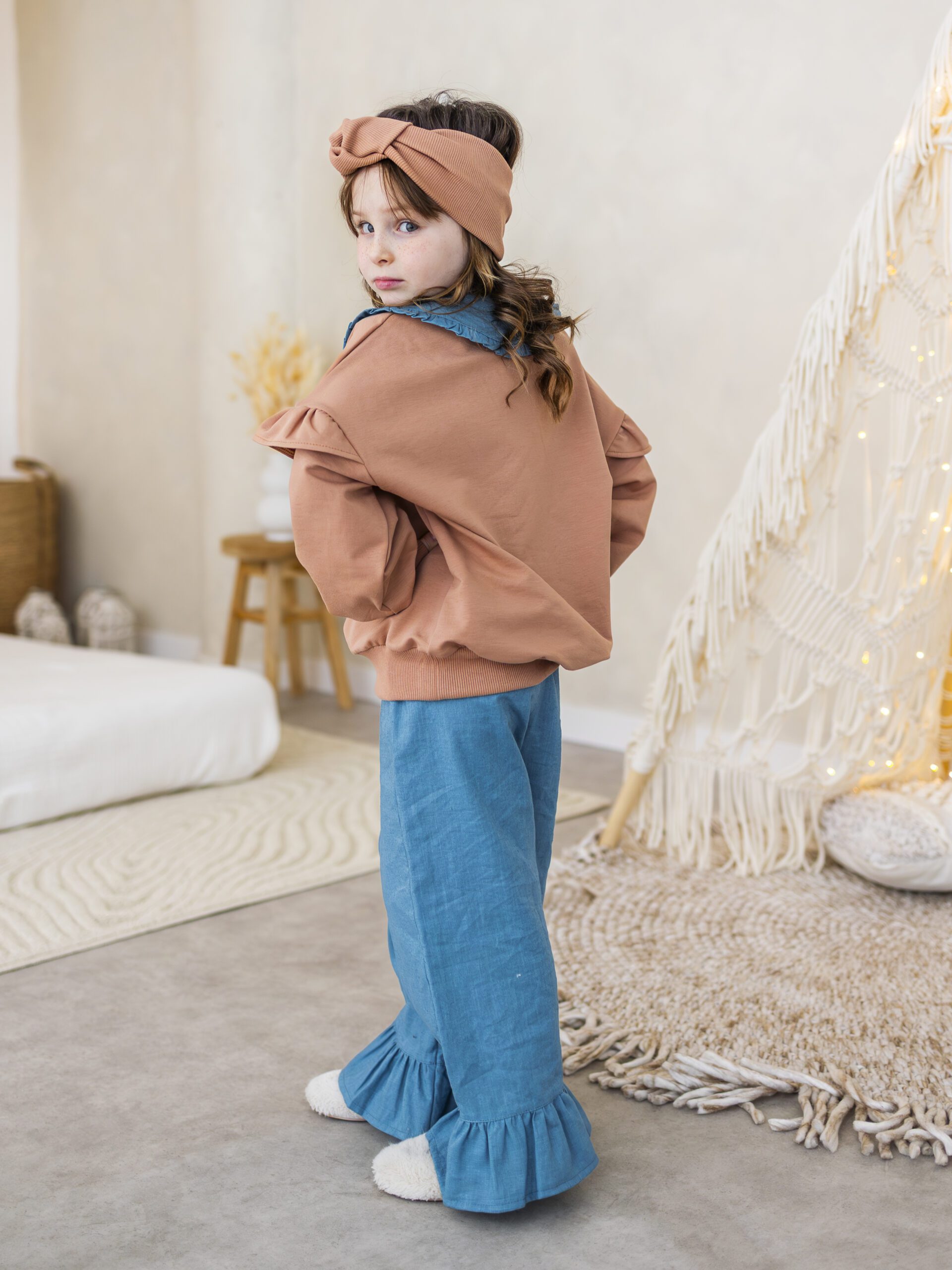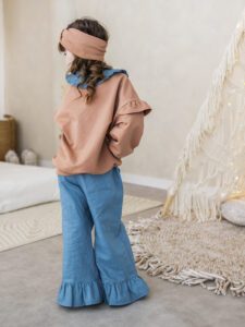 - Modny fason – bluza z falbankami + spodnie dzwony = stylowy look małej fashionistki.