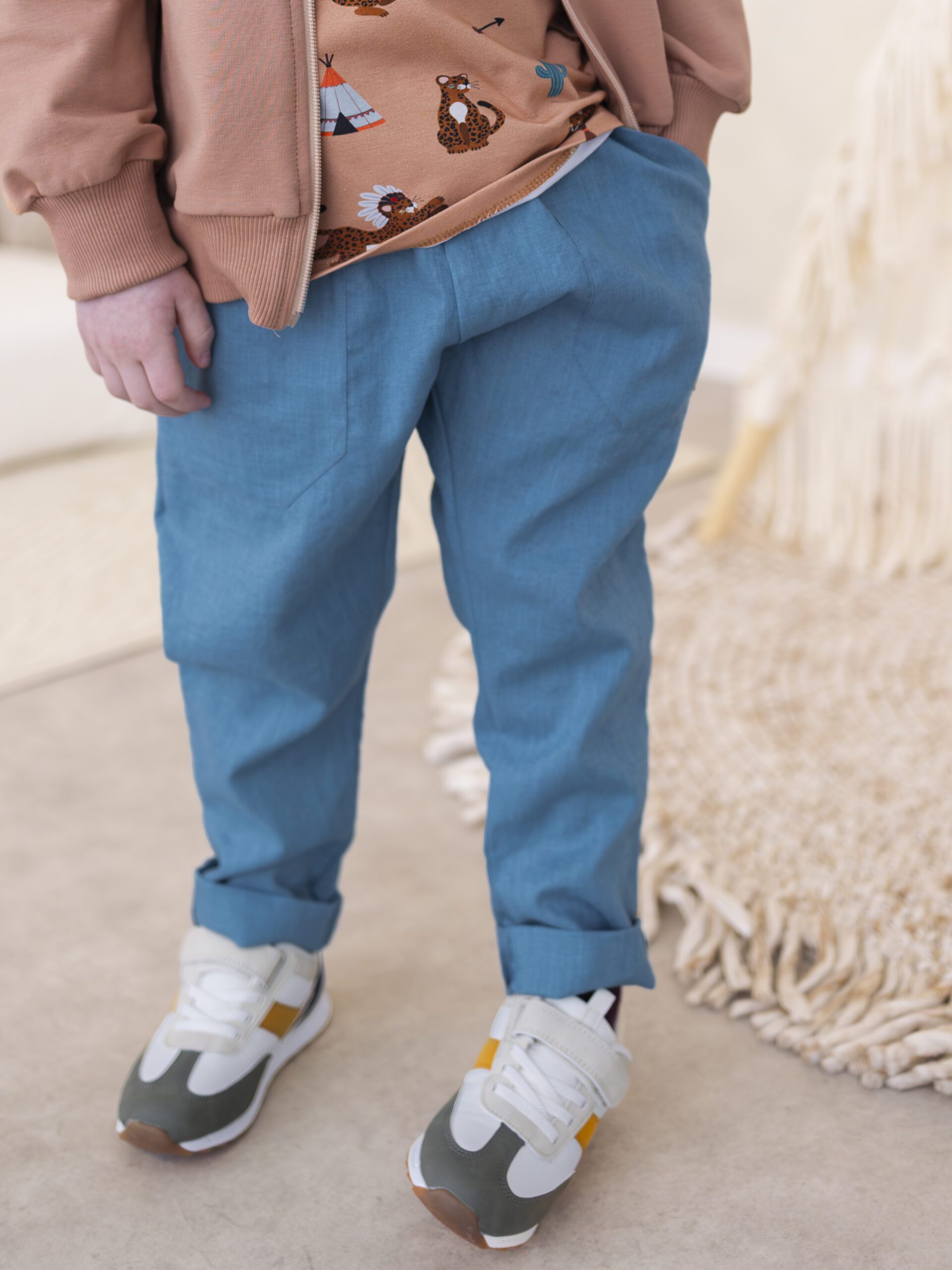 Do kompletu dołączone są spodnie baggy z lnu w kolorze morskim, które łączą wygodę z elegancją. Naturalna tkanina lniana jest przewiewna i idealna na cieplejsze dni. Spodnie posiadają praktyczne kieszenie oraz wywinięcie nogawek, dzięki któremu można regulować długość – rozwiązanie idealne dla rosnącego dziecka. Luźny krój typu baggy zapewnia swobodę ruchów i nowoczesny wygląd.