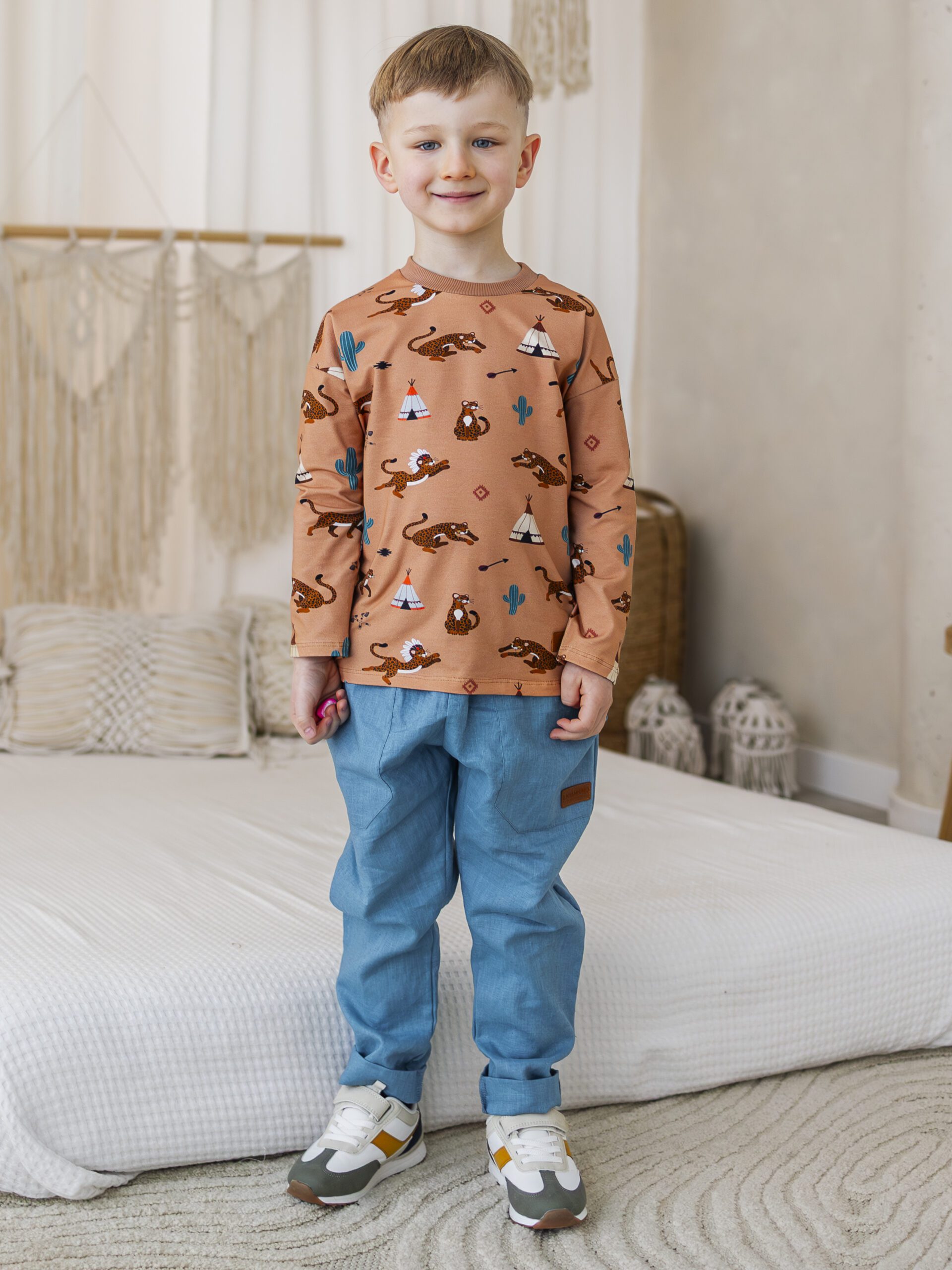 Postaw na komfort, naturalne materiały i ponadczasowy styl – wybierz komplet LONG GEPARD i baggy len MORSKI dla swojego chłopca.