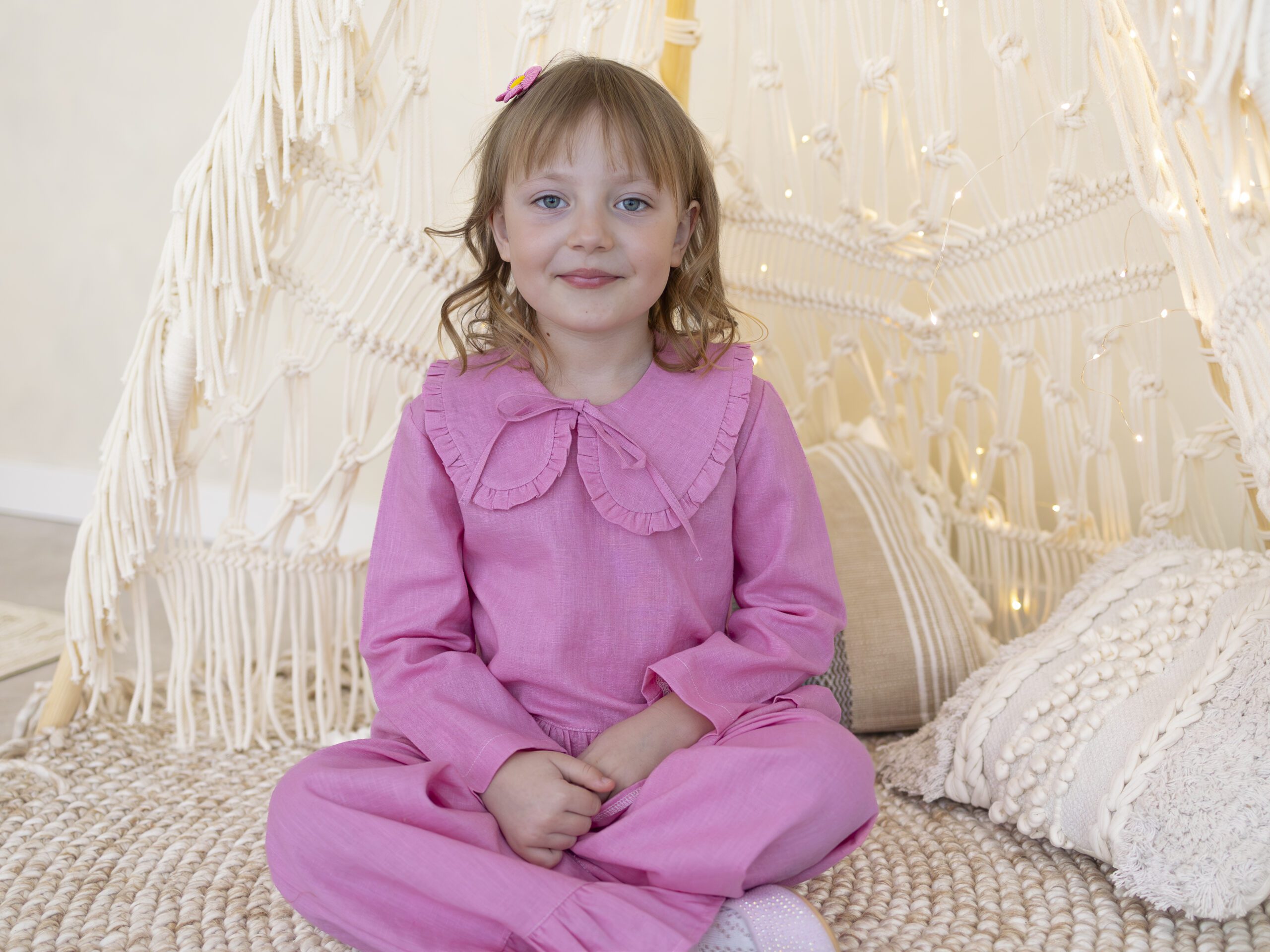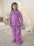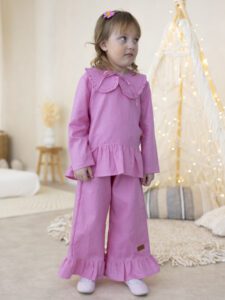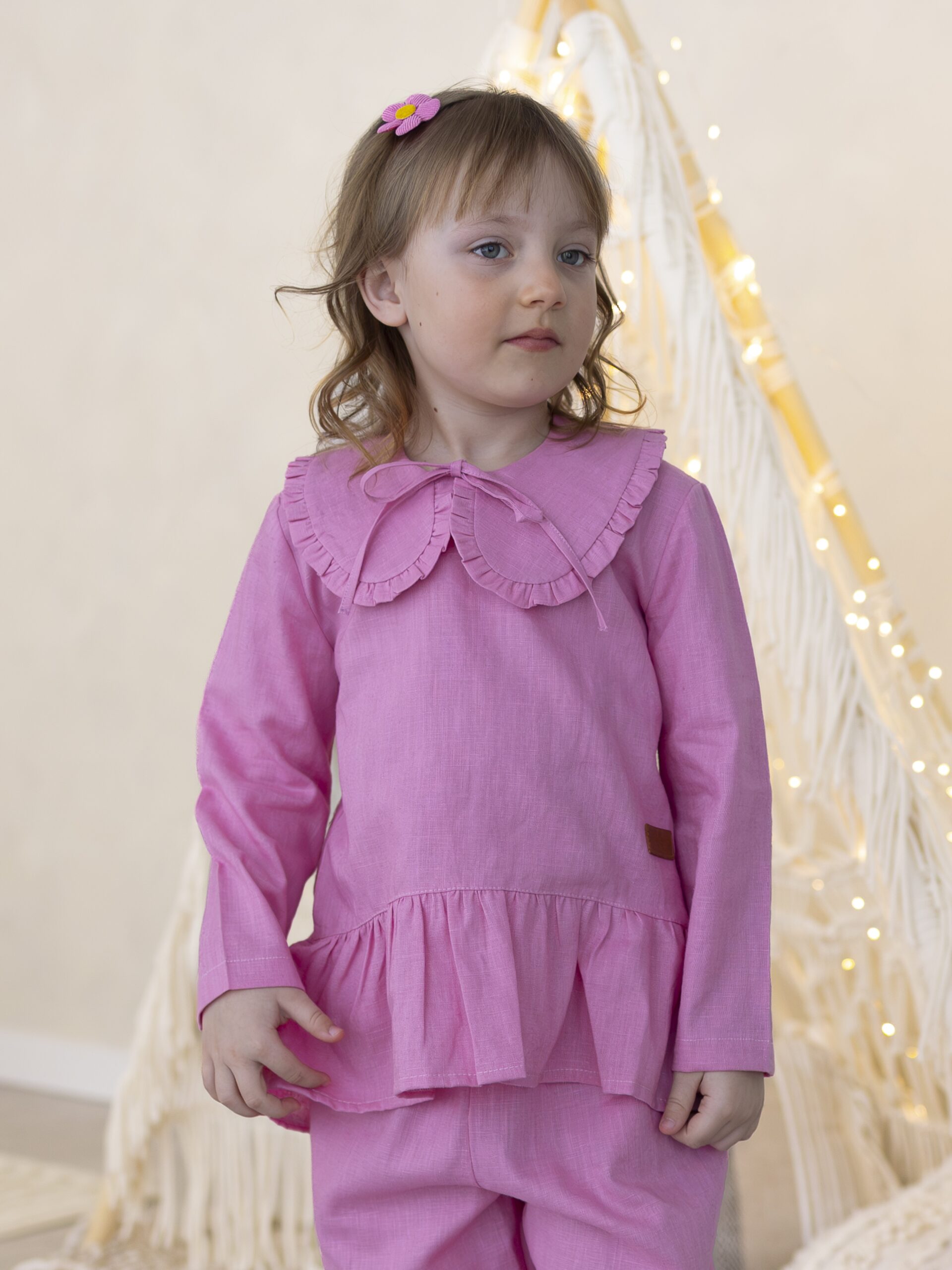 Do kompletu dołączone są szerokie spodnie dla dziewczynki wykonane z naturalnego lnu. Model posiada praktyczne kieszenie oraz marszczony, elastyczny pas, który zapewnia idealne dopasowanie i wygodę przez cały dzień. Nogawki wykończone subtelną falbanką nadają stylizacji dziewczęcej lekkości i wyjątkowego uroku.