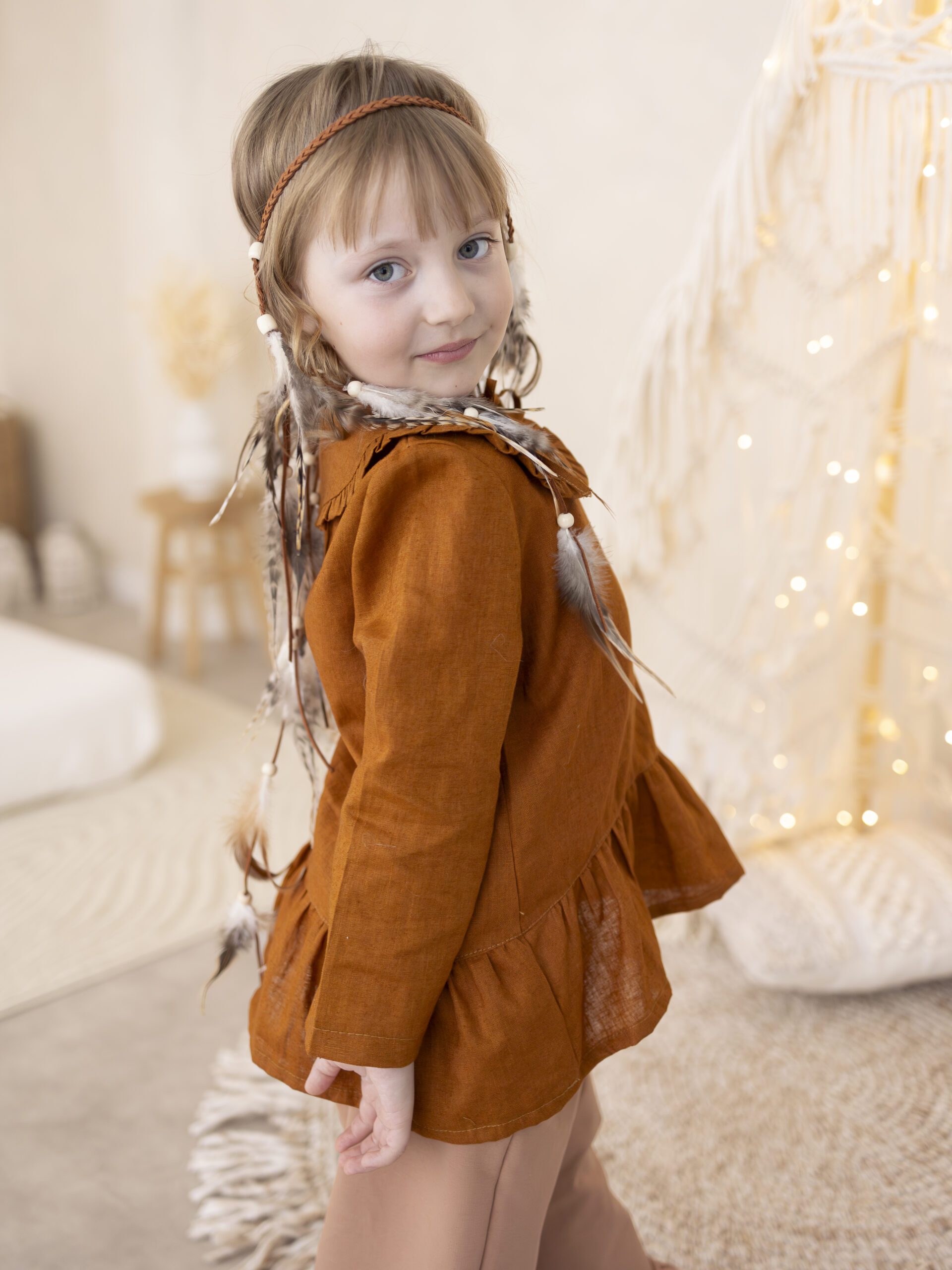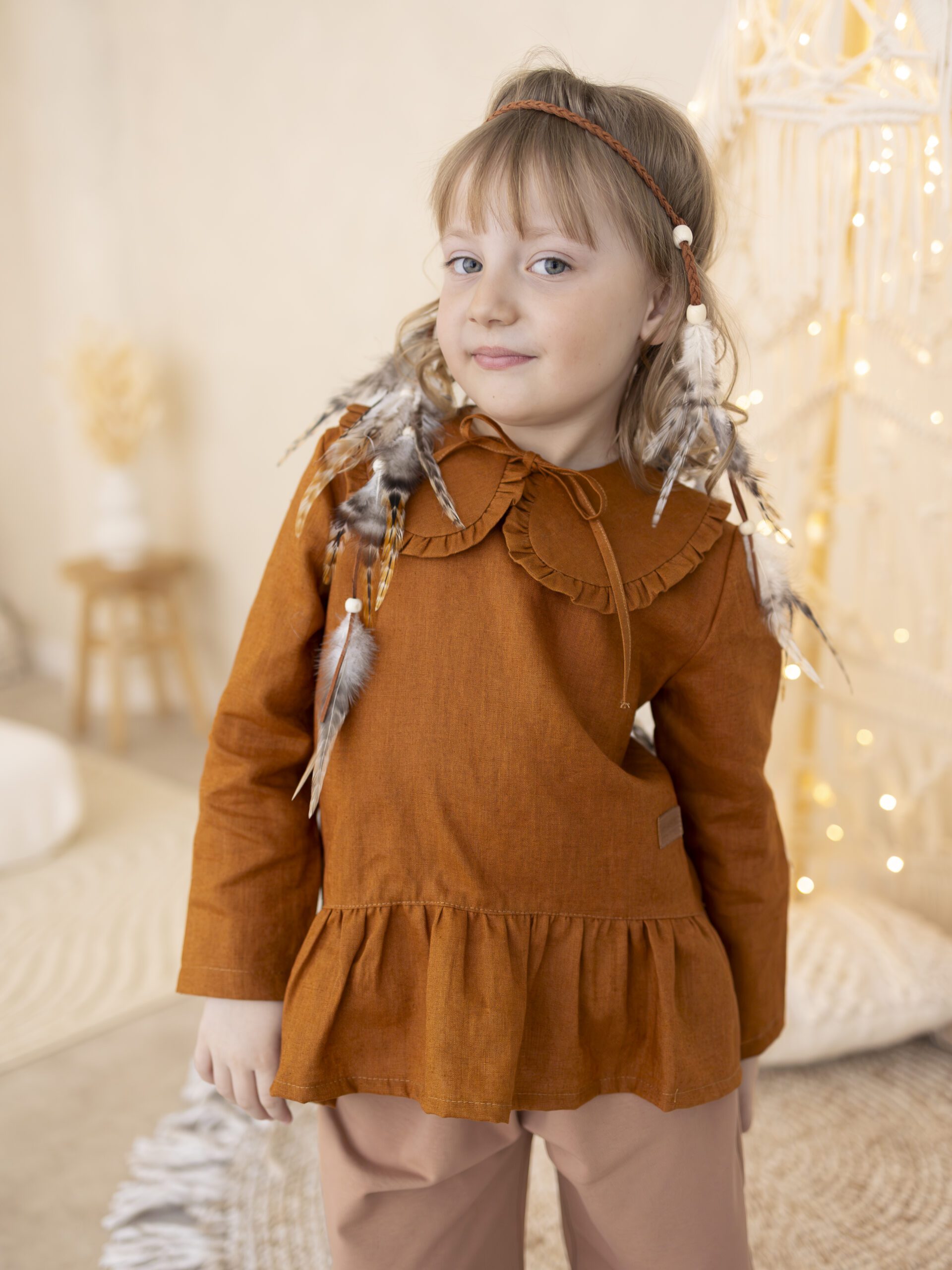 Do kompletu dołączone są szerokie spodnie dla dziewczynki wykonane z naturalnego lnu. Model posiada praktyczne kieszenie oraz marszczony, elastyczny pas, który zapewnia idealne dopasowanie i wygodę przez cały dzień. Nogawki wykończone subtelną falbanką nadają stylizacji dziewczęcej lekkości i wyjątkowego uroku.